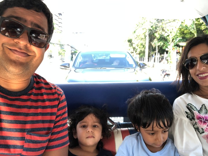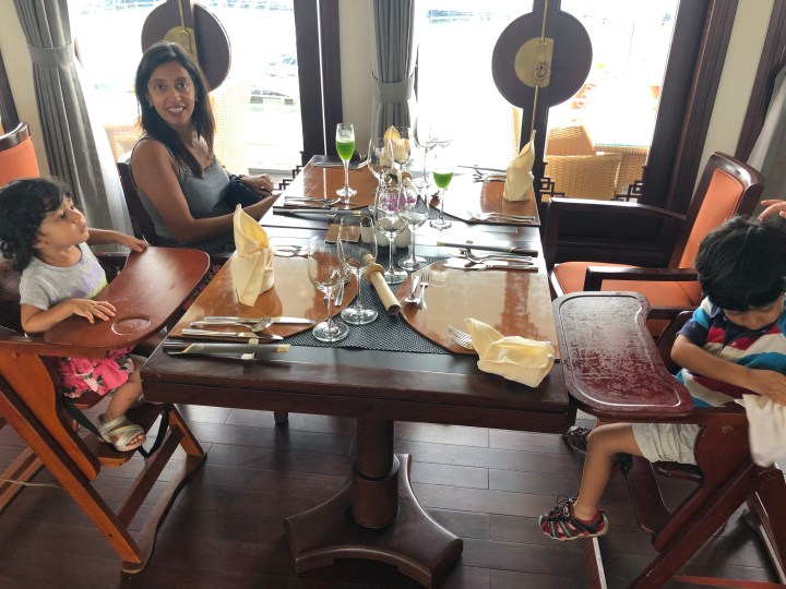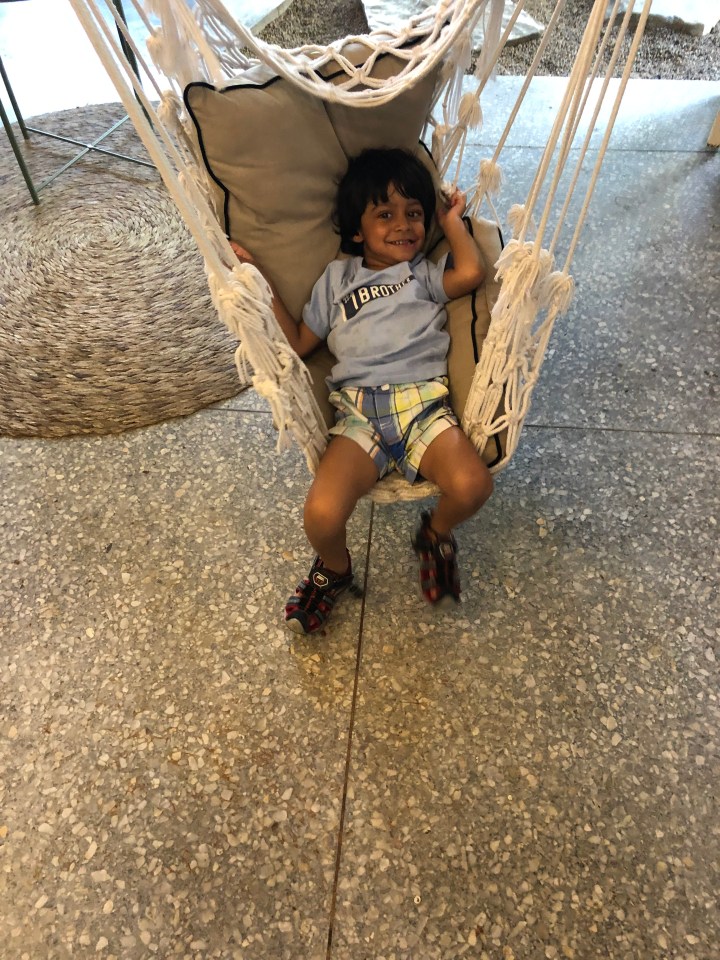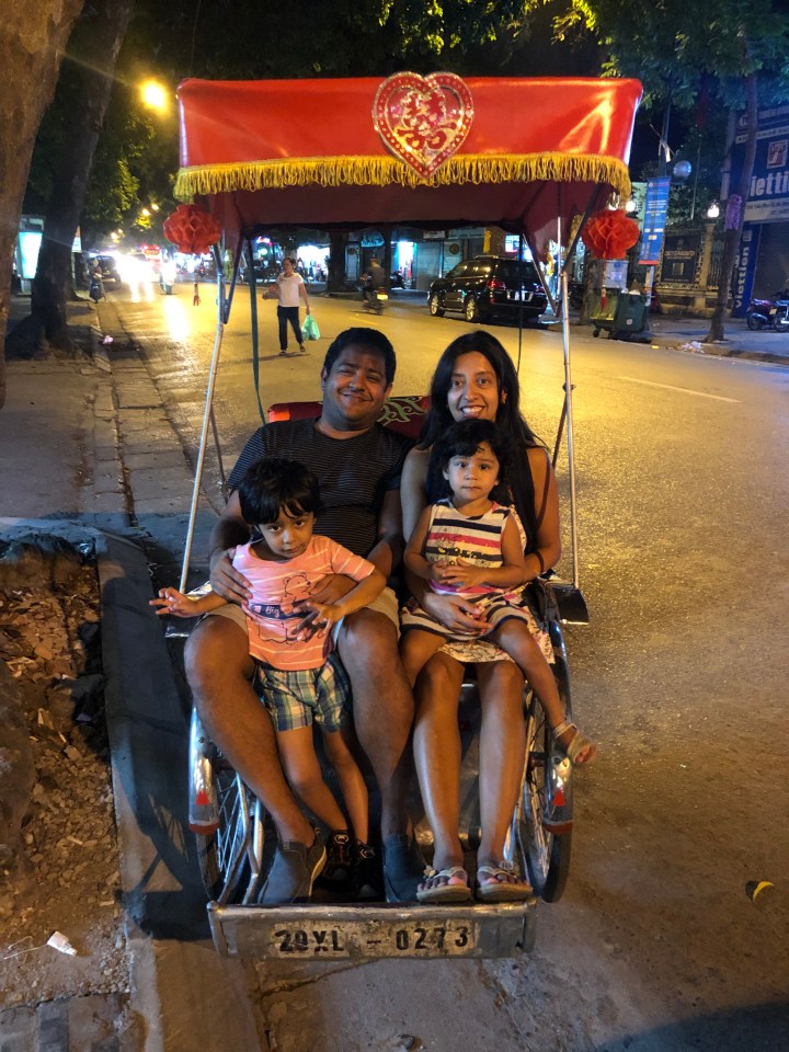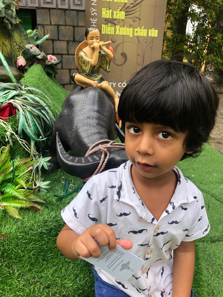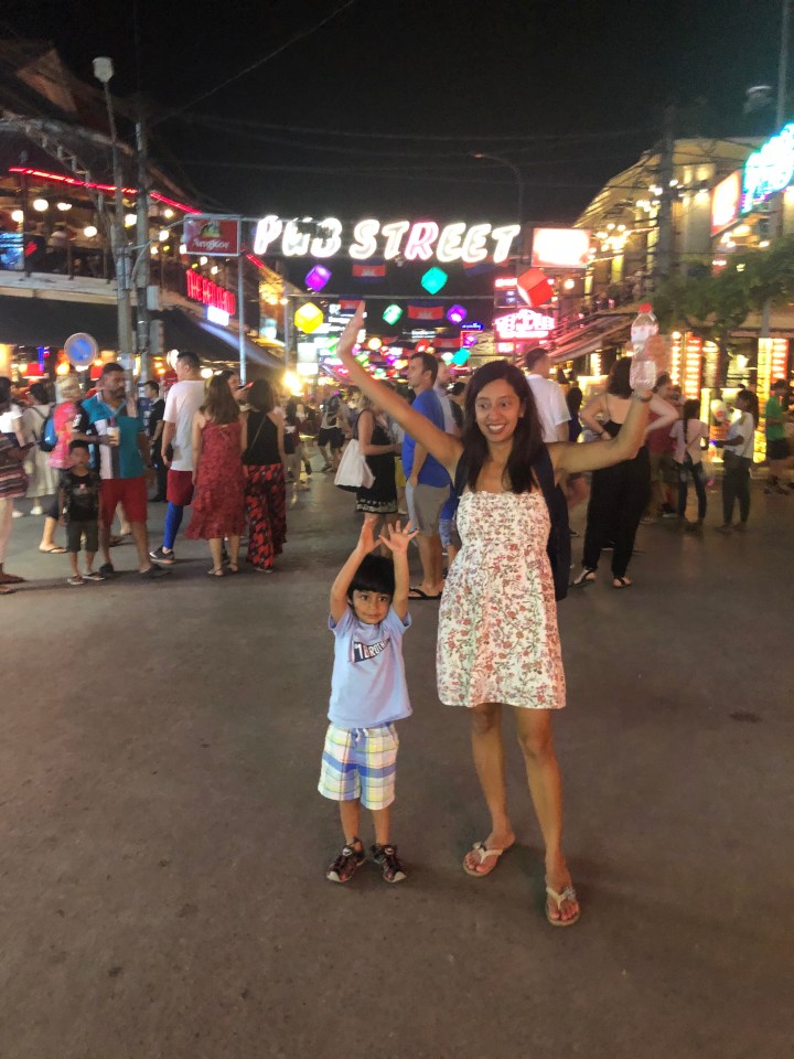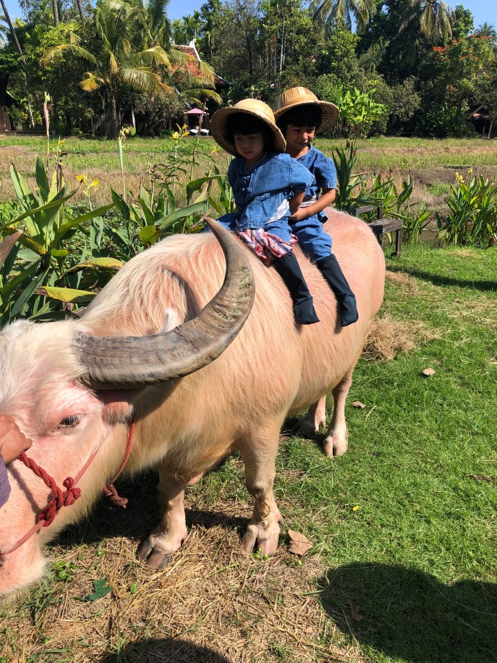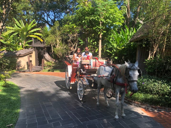 We were excited when we awoke the next morning since we were checking in to the luxurious Dhara Dhevi hotel in Chiang Mai. We took a ‘Grab’ (equivalent of uber in Asia) and were greeted by stunning grounds as we approached the hotel. The main lobby as well as most of the villas looked like temples with golden tops, and the grounds were lush and green. We spent a relaxing couple of days here, alternating between the resort pools, the kids club and the various restaurants. Ayaan enjoyed the buggies that would transport us within the resort as well as the local arts and crafts center where he made fish and frogs out of colored bamboos. The highlight of our stay was our family dressing up as local farmers and planting rice with the water buffalos while being serenaded with live music. The kids even played in their own little ‘orchestra’. Gaurav and I did manage to get a date night in at a nice, Italian restaurant while we left the kids with a caring sitter from the resort. We really enjoyed dining as a family in our outdoor living room on the last night as well. On the last day, a horse carriage took us around the resort before we left for our flight to Phuket.