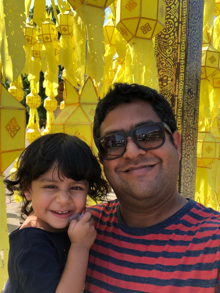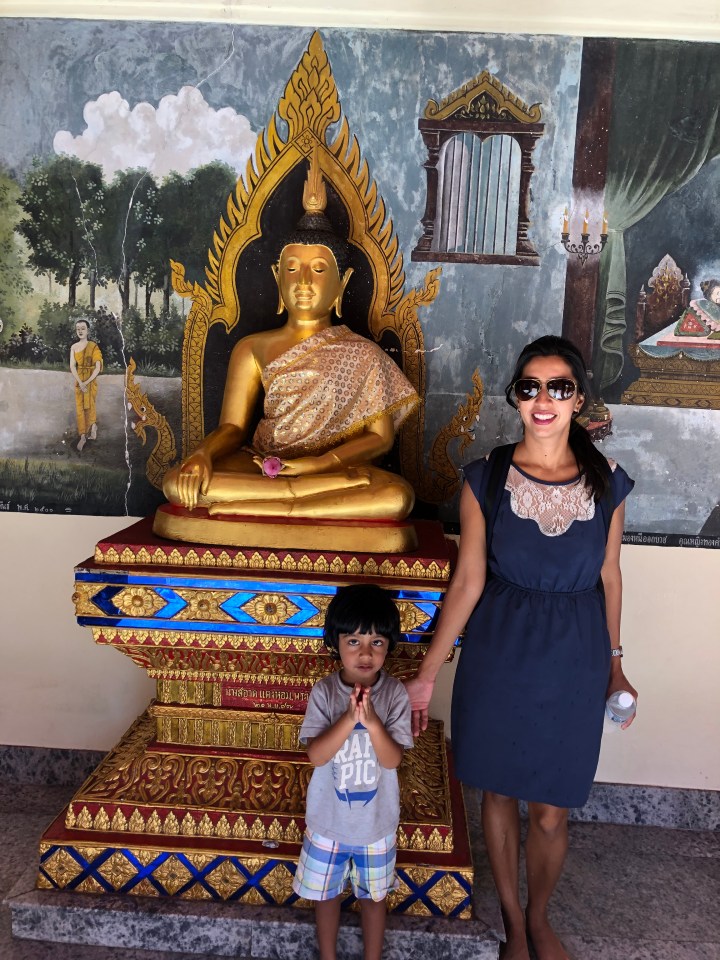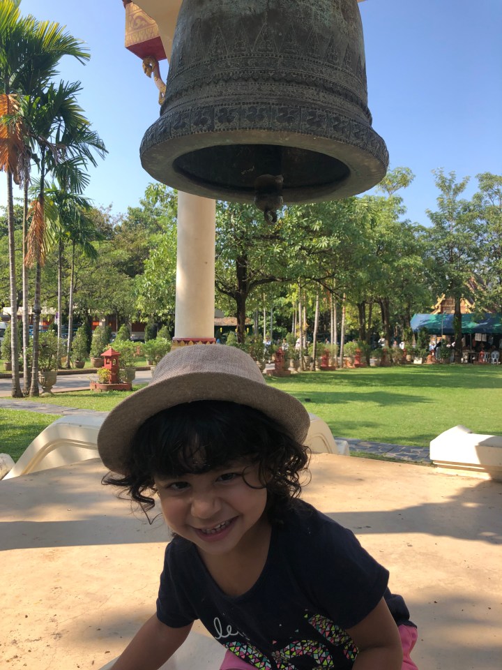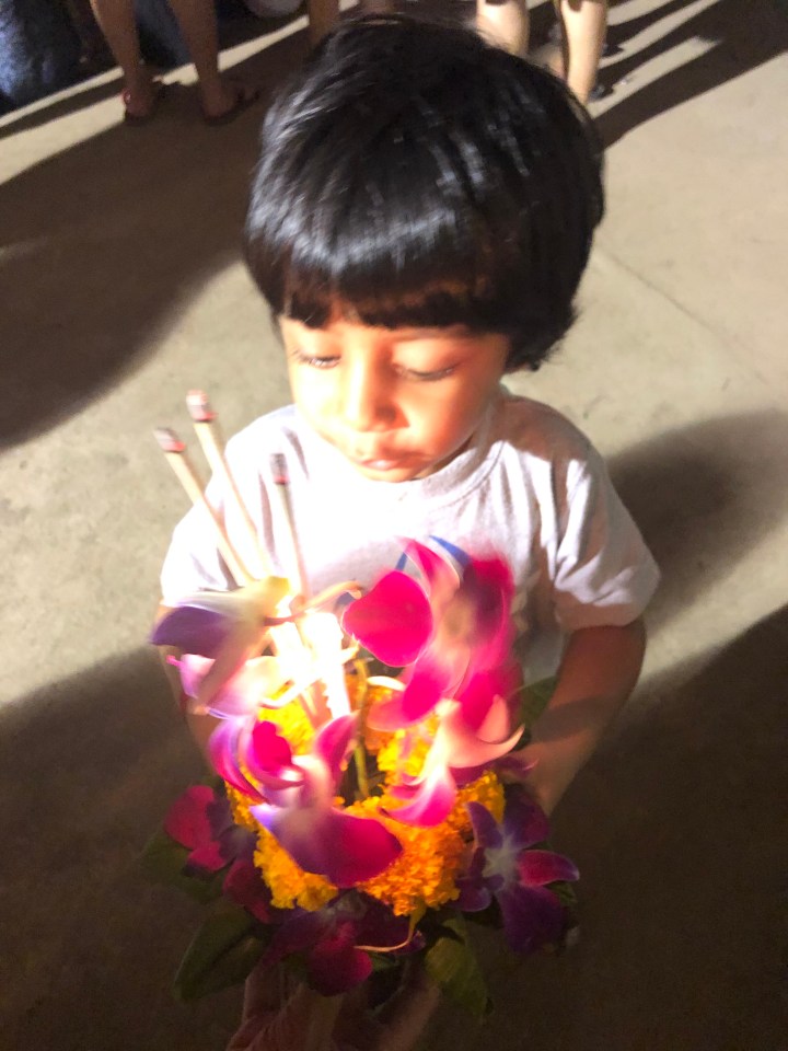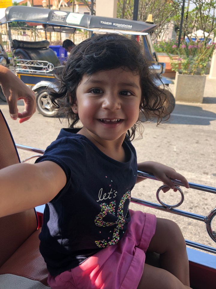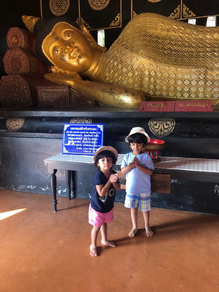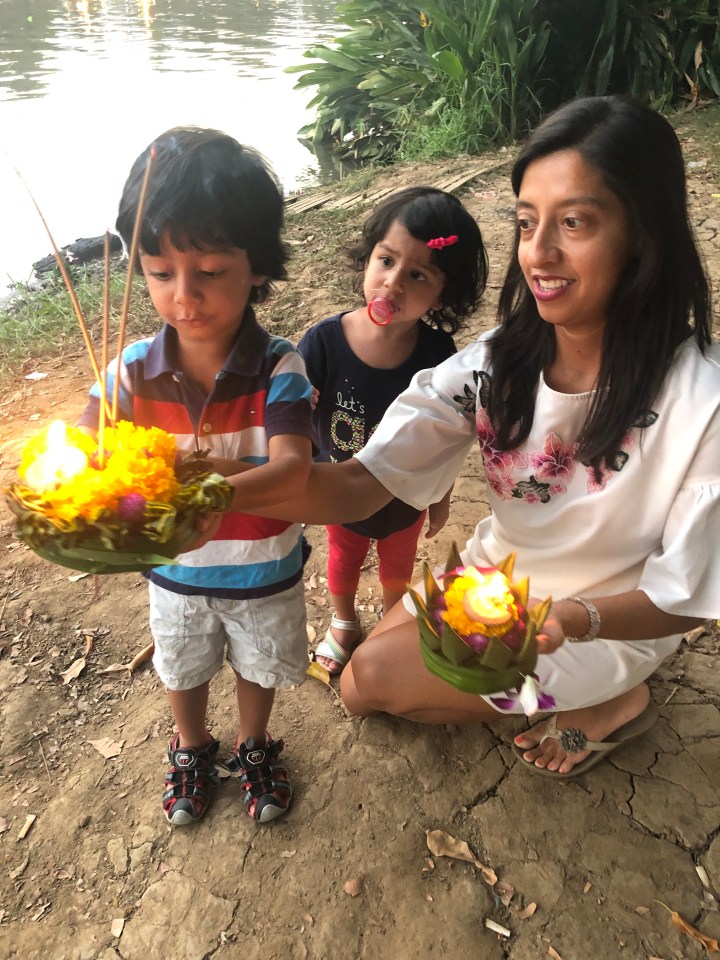 I had high expectations for Chiang Mai….and it beat all those expectations! We were extremely lucky to have been in the city during the Loy Krathong (Floating baskets) and Yee Peng (Floating lanterns) festival which coincide with each other in Chiang Mai during the full moon. The entire city is adorned with beautiful colorful lanterns which are particularly prevalent in the city’s numerous temples. This festive atmosphere added a new level of charm and delight to this already beautiful city. As we approached the city from the airport, Ayaan started pointing out the lantern decorations along the way. Since the kids were relatively tired from the flight, we decided to dine at the hotel restaurant which turned out to be a fantastic meal of Penang curry and our favorite pad see ew. After the kids slept, Gaurav and I chatted in the balcony for a while before turning in for the night. The next morning, we took a 40-minute ride up the mountain to the famous Doi Suthep temple. As we ascended, we were greeted with views of the city below as well as Buddha statues and temples along the way. Ariana fell asleep as we approached requiring Gaurav to carry her up multiple flights of stairs to the top of the temple. Bright golden hues and several Buddha statues makes this temple particularly stunning! Ayaan enjoyed being blessed by the monk with water drops and a string around his hand. Ariana enjoyed playing catch with the new friends she’d made. We returned to the mall near our hotel for lunch and the kids enjoyed playing with the kiddie planes and cars and the huge Christmas tree outside. I seized the opportunity to get a foot massage near our hotel while the kids napped. That evening, we set out to enjoy the festivals and got dropped off near the banks of the Ping river. We dined at Woo, a restaurant and art gallery that was casual yet classy. We enjoyed a Khow Soi, A classic Chiang Mai dish of noodles and curry topped off with several condiments. Toward the end of our meal, we noticed the lanterns floating in the sky and decided to skip dessert and hit the streets. We walked along the ping river and stopped on the bridge. Thousands of lanterns were released into the sky and as they floated up, they illuminated the entire sky. Down below, the river was lit by thousands of small flower boats and baskets with candles and incense sticks, making for another feast for the eyes. It was a sight to marvel at, and we felt lucky to experience it. Ayaan bought his own floating boat which we released into the water, which is believed to release all ill and unhappiness.