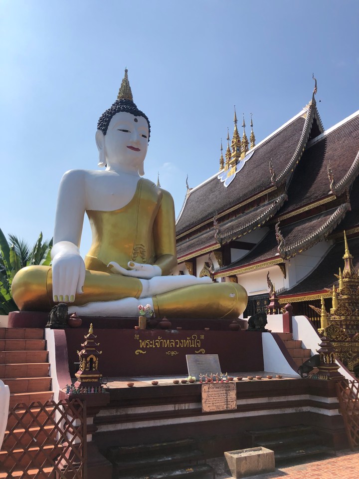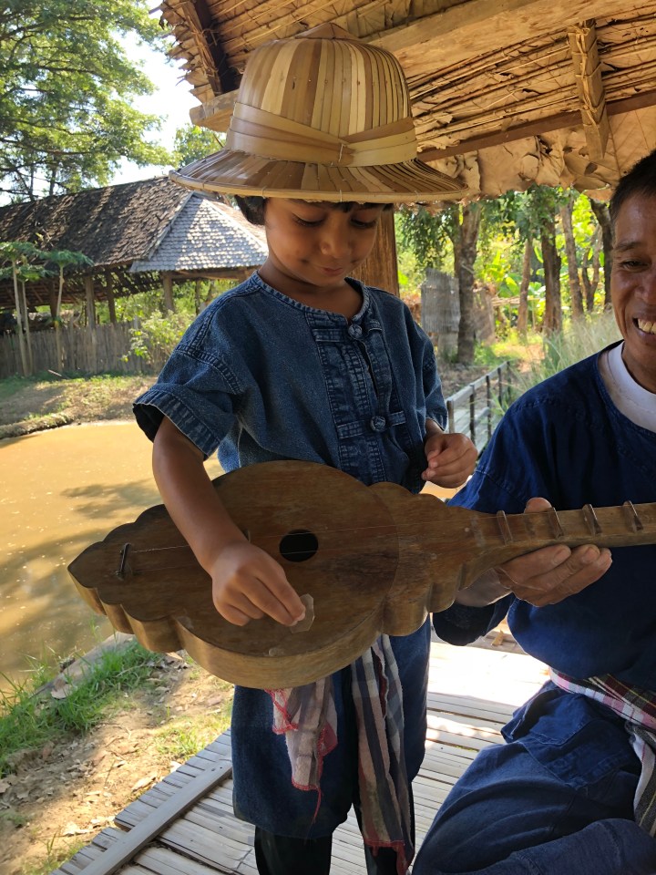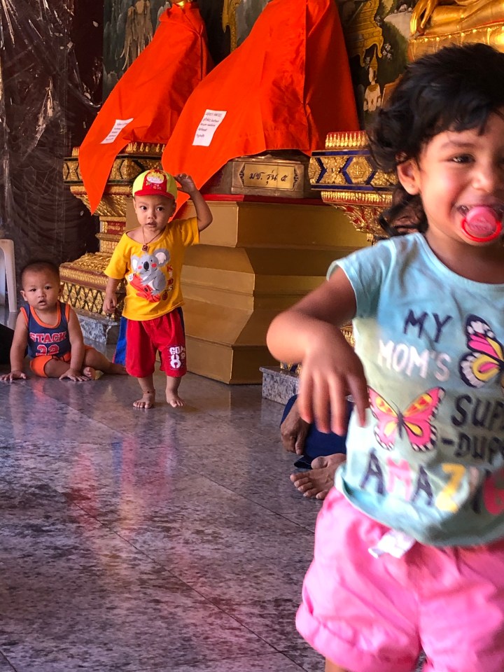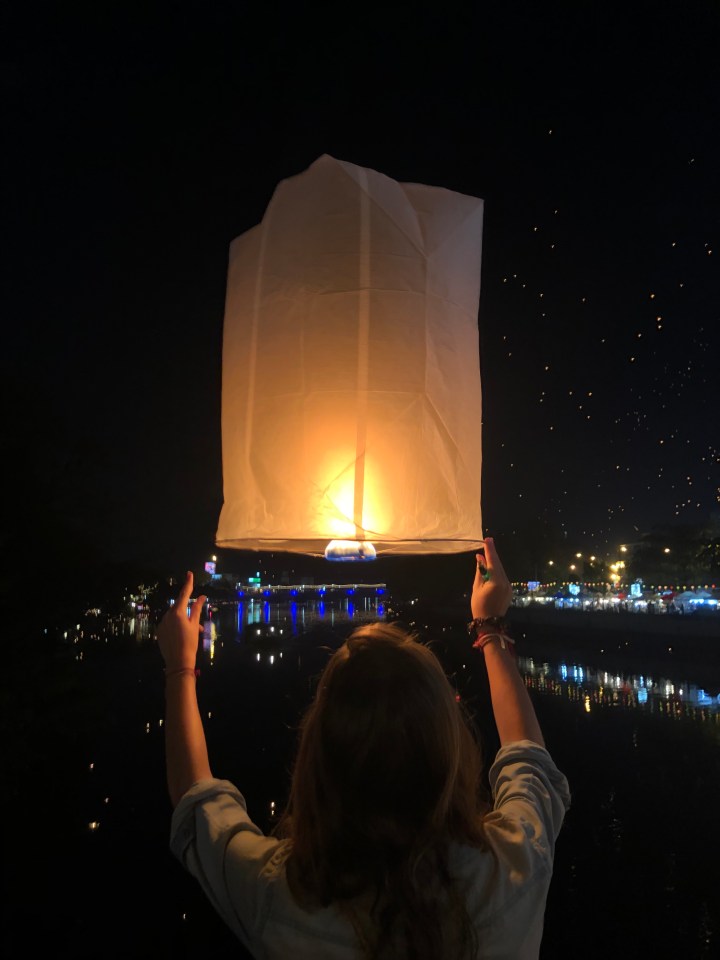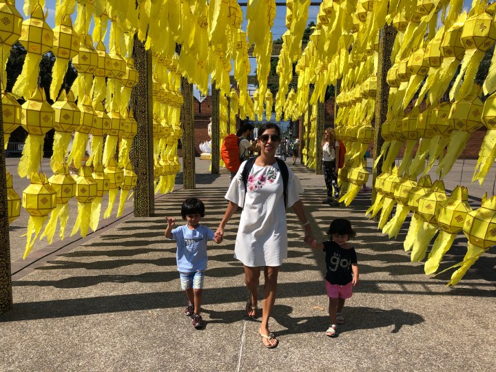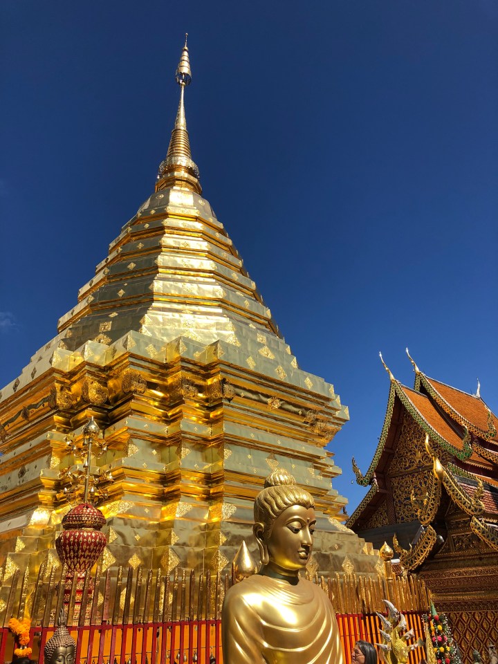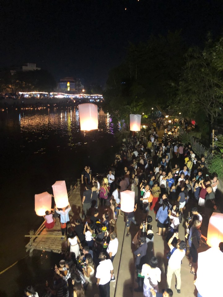 I had high expectations for Chiang Mai….and it beat all those expectations! We were extremely lucky to have been in the city during the Loy Krathong (Floating baskets) and Yee Peng (Floating lanterns) festival which coincide with each other in Chiang Mai during the full moon. The entire city is adorned with beautiful colorful lanterns which are particularly prevalent in the city’s numerous temples. This festive atmosphere added a new level of charm and delight to this already beautiful city. As we approached the city from the airport, Ayaan started pointing out the lantern decorations along the way. Since the kids were relatively tired from the flight, we decided to dine at the hotel restaurant which turned out to be a fantastic meal of Penang curry and our favorite pad see ew. After the kids slept, Gaurav and I chatted in the balcony for a while before turning in for the night. The next morning, we took a 40-minute ride up the mountain to the famous Doi Suthep temple. As we ascended, we were greeted with views of the city below as well as Buddha statues and temples along the way. Ariana fell asleep as we approached requiring Gaurav to carry her up multiple flights of stairs to the top of the temple. Bright golden hues and several Buddha statues makes this temple particularly stunning! Ayaan enjoyed being blessed by the monk with water drops and a string around his hand. Ariana enjoyed playing catch with the new friends she’d made. We returned to the mall near our hotel for lunch and the kids enjoyed playing with the kiddie planes and cars and the huge Christmas tree outside. I seized the opportunity to get a foot massage near our hotel while the kids napped. That evening, we set out to enjoy the festivals and got dropped off near the banks of the Ping river. We dined at Woo, a restaurant and art gallery that was casual yet classy. We enjoyed a Khow Soi, A classic Chiang Mai dish of noodles and curry topped off with several condiments. Toward the end of our meal, we noticed the lanterns floating in the sky and decided to skip dessert and hit the streets. We walked along the ping river and stopped on the bridge. Thousands of lanterns were released into the sky and as they floated up, they illuminated the entire sky. Down below, the river was lit by thousands of small flower boats and baskets with candles and incense sticks, making for another feast for the eyes. It was a sight to marvel at, and we felt lucky to experience it. Ayaan bought his own floating boat which we released into the water, which is believed to release all ill and unhappiness.