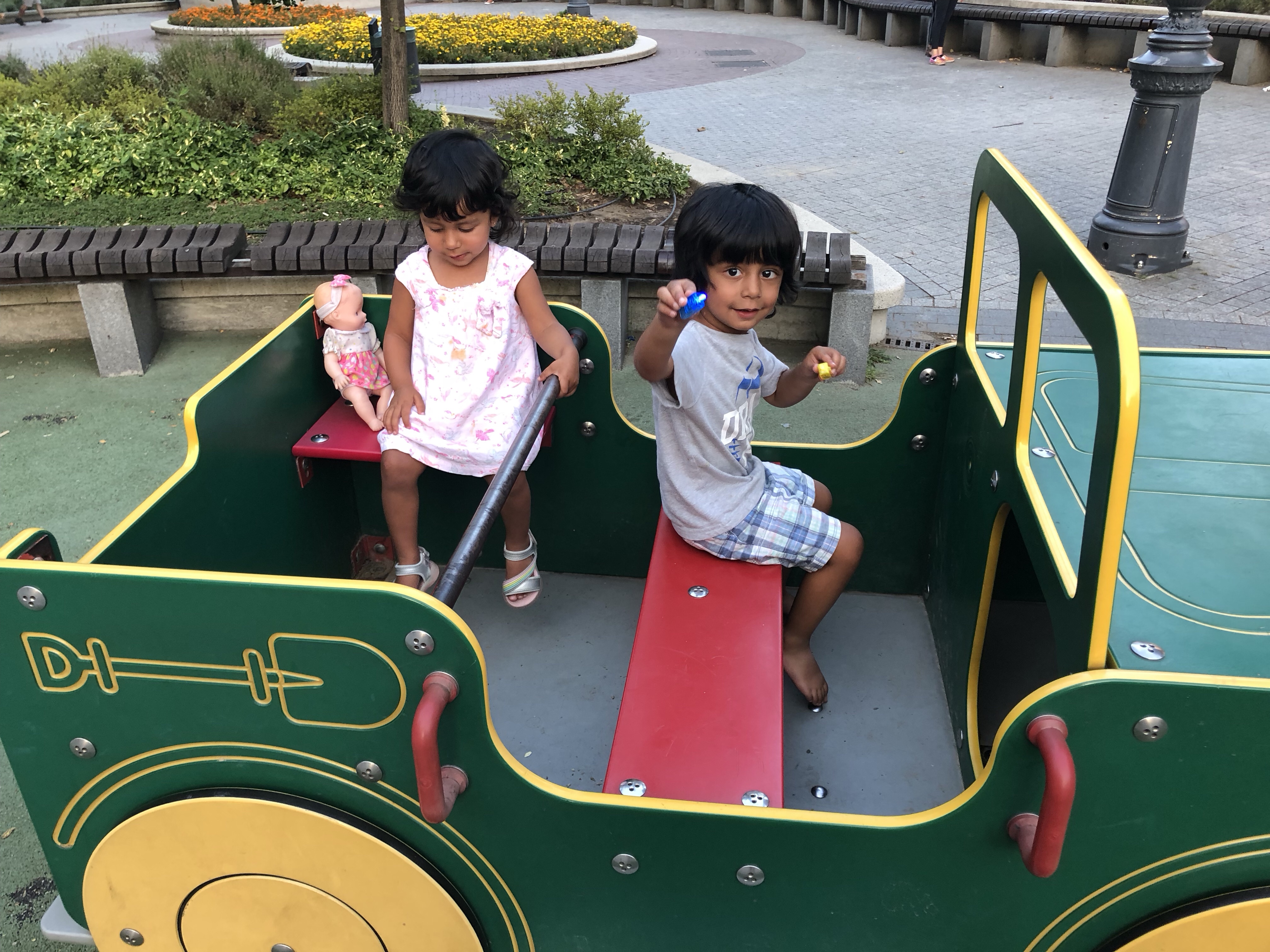 After a wonderful week in Costa Brava, we drove back to Barcelona to take a seamless Vueling flight to Mallorca (all bags intact this time!). We were excited to visit our 2nd Balaeric island after Ibiza ten years ago. From the airport we drove to Valldemossa on the west of the island where we visited the monastery, palace and the gardens after a quick lunch. The kids were fascinated by the gigantic statues of the king and queen, similar to what they had seen in Barcelona. From there we drove to the little town of Cala pi where the kids found a playground and we ate some amazing Paella at Restaurant Sa Teressa. The highlight of the day was meeting Nani, Dhara masi, Kunal uncle and his family at a beautiful beachfront house in Colonia sant Jordi, on the south side of the island. The kids were delighted to meet family and to get to stay up way past their bed time!