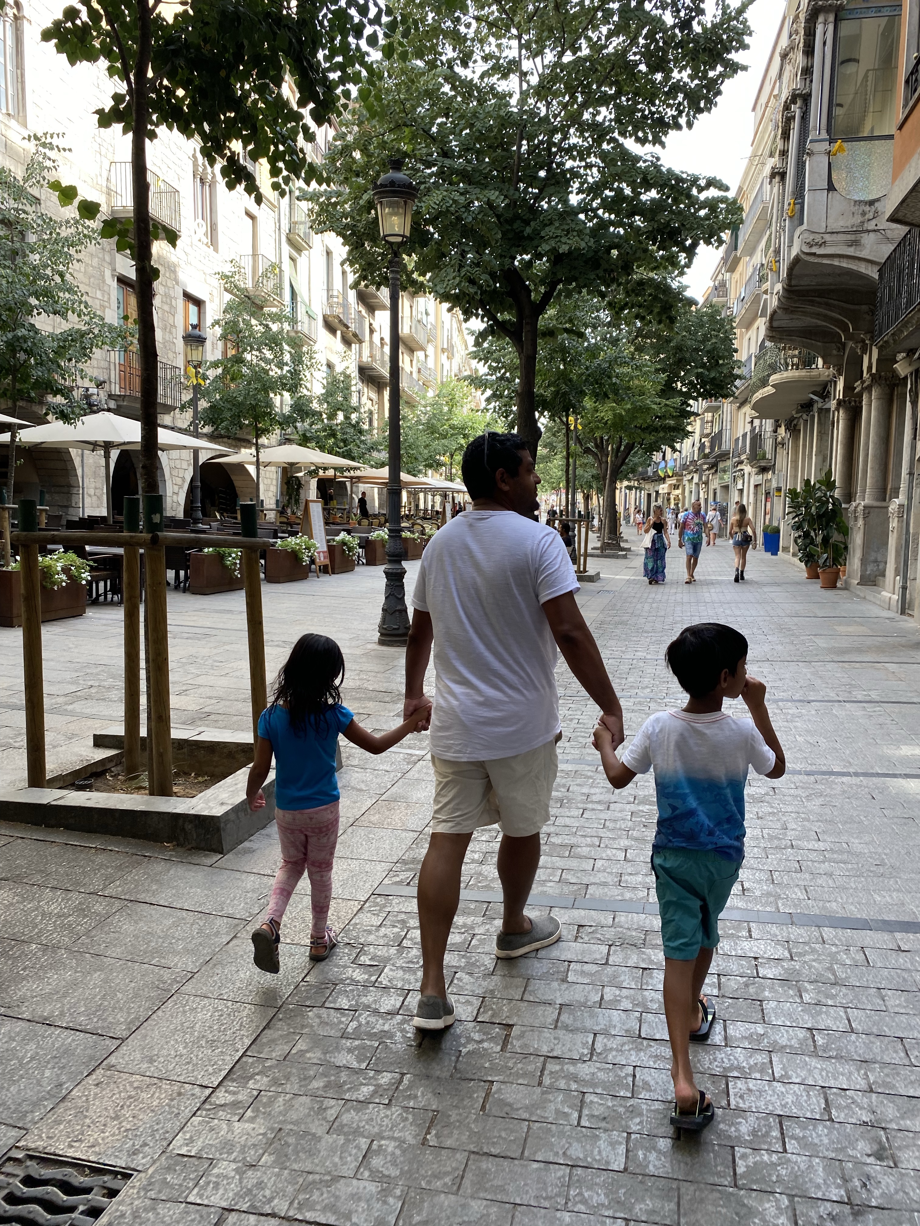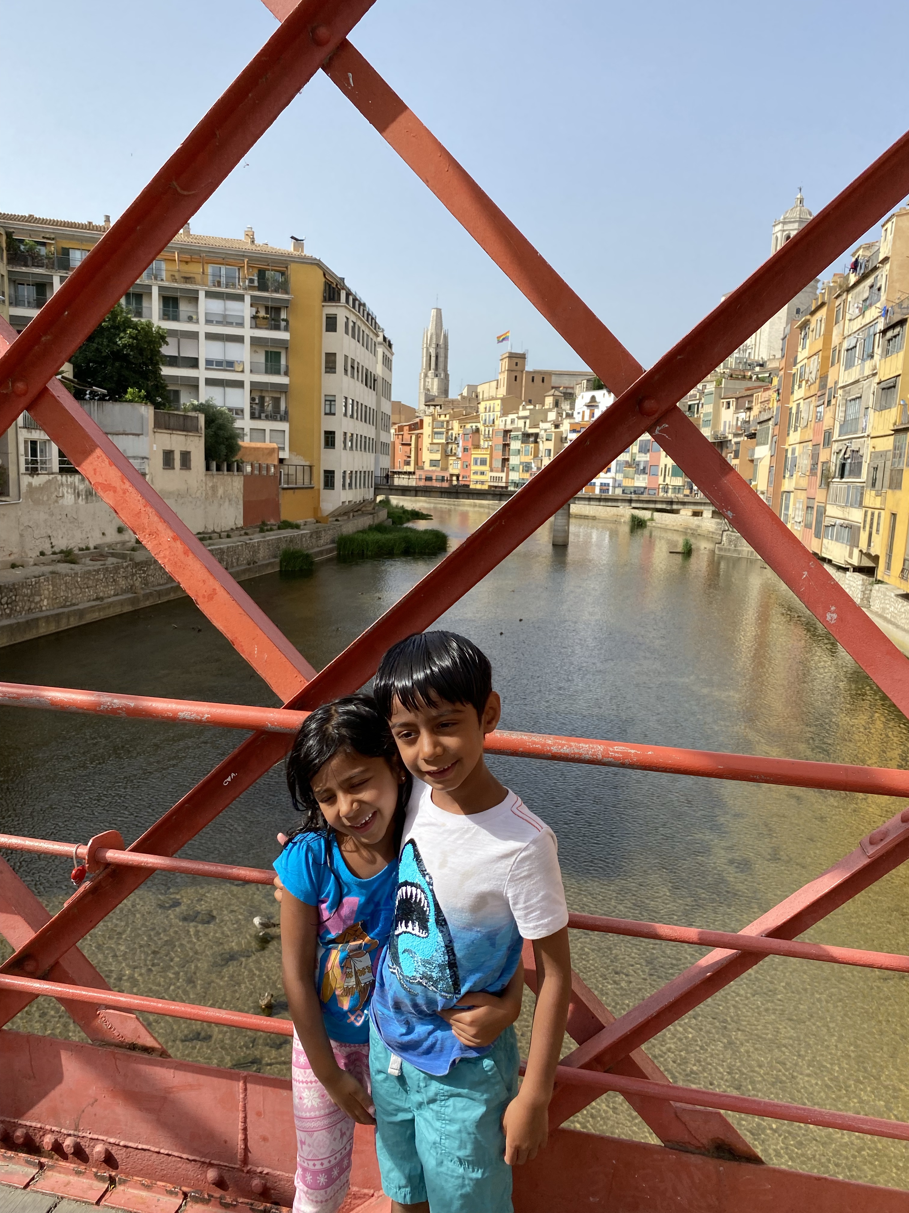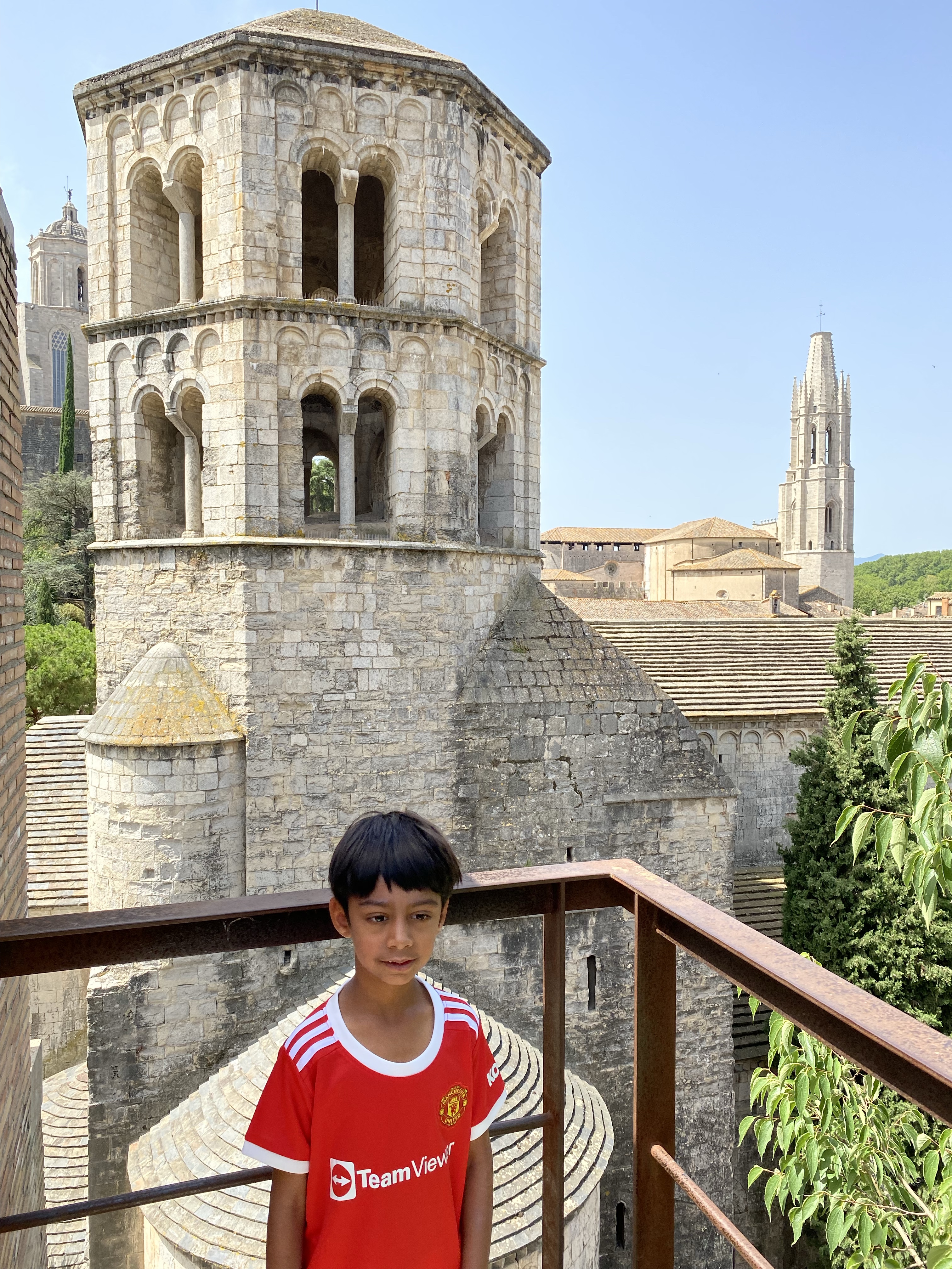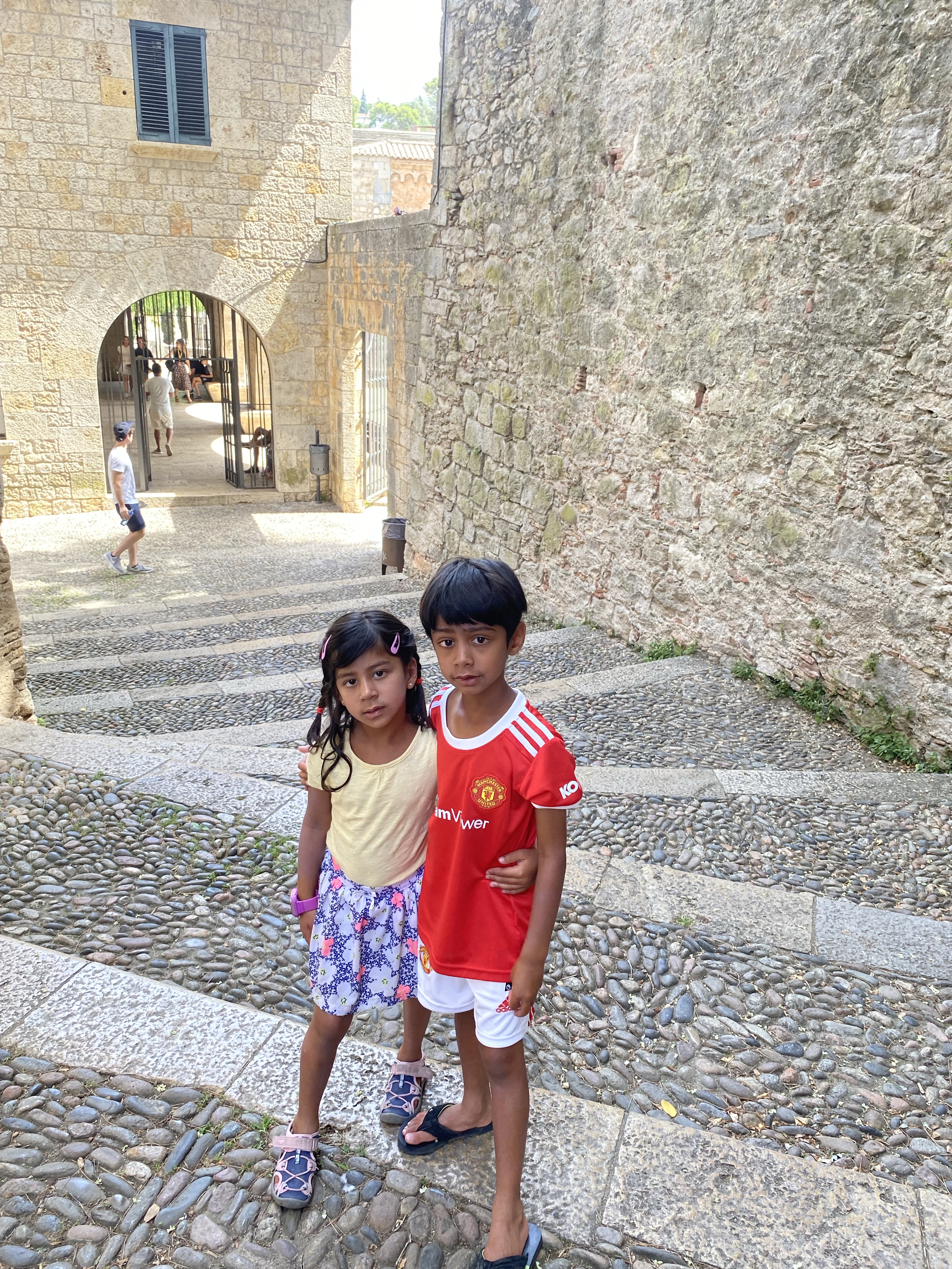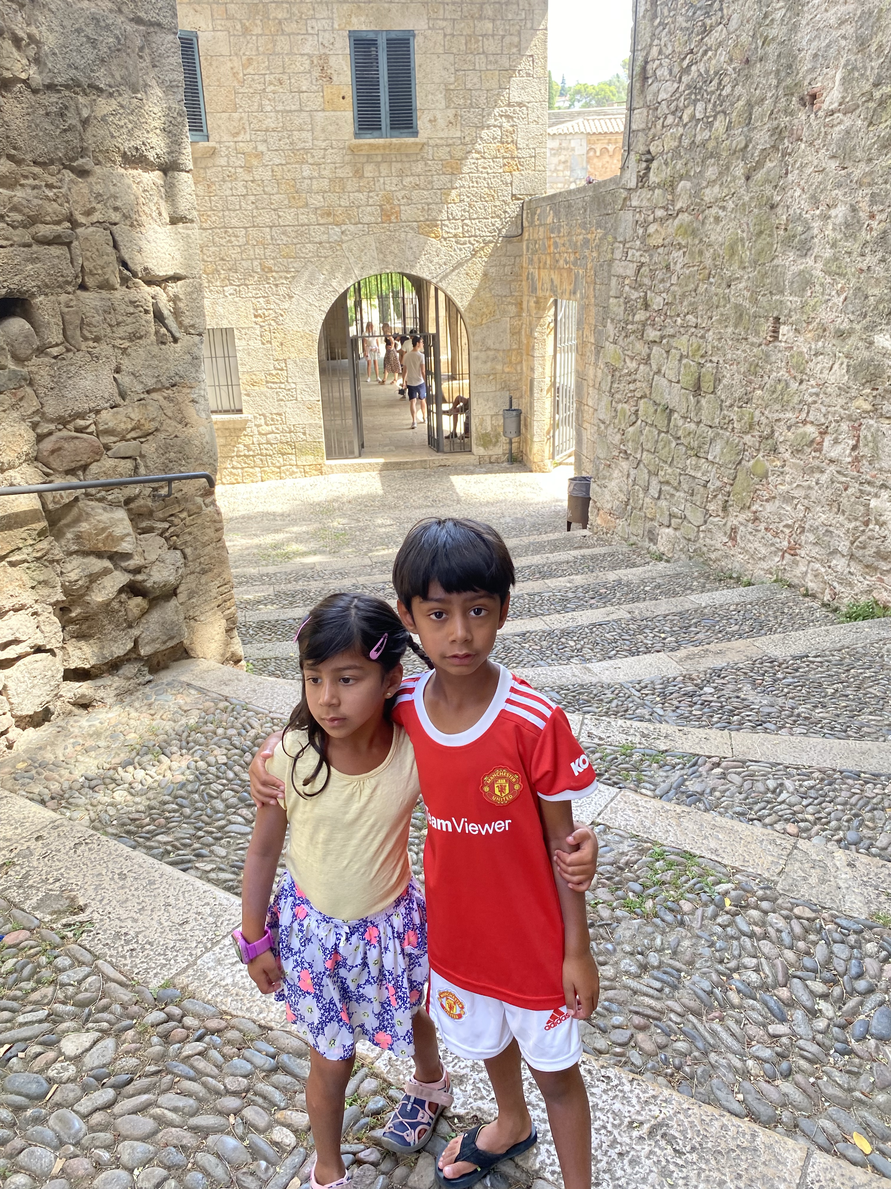 On our last day in Girona, we strolled to the magnificent cathedral, the Arab baths, the walls of the old town, the Basilica de Sant Feliu and marveled at the charming beauty of Girona. We then decided to take our apartment host’s recommendation for lunch at a Basque Country restaurant, and enjoyed some delicious pinxtos, steak and garlic prawns, followed by 7 (pinxto) desserts! After lunch, we took turns getting Aromatherapy massages, while the other parent relaxed in the apartment with the kids. In the evening, we revelled at getting lost around the old town walls and cobblestoned streets (Ayaan in his soccer Manchester United soccer jersey bouncing around his new soccer ball). After dinner comprising pepperoni pizza and brut rose, Ayaan and Ariana helped me dry our clean laundry, and we then settled in for an early night, to prepare for our flight the next morning to Mallorca. Looking forward to seeing Nani, Dhara Masi and Kunal Uncle!