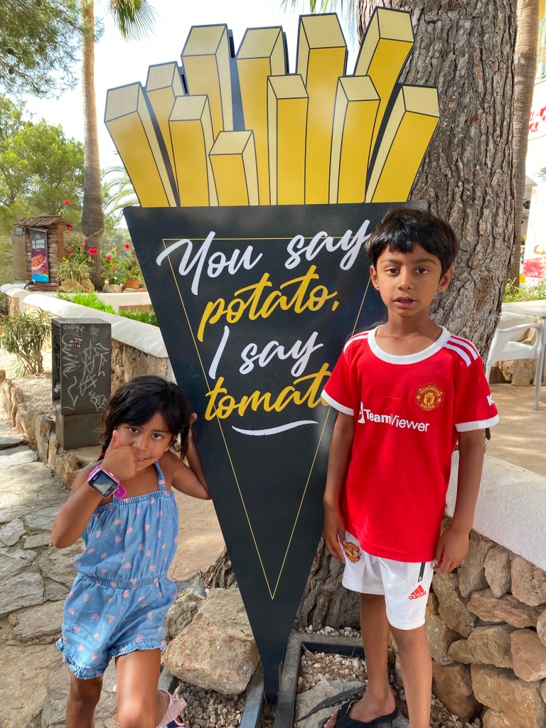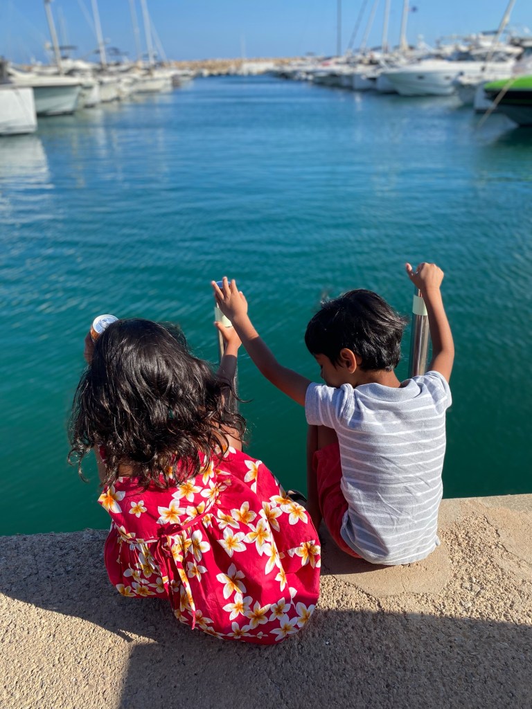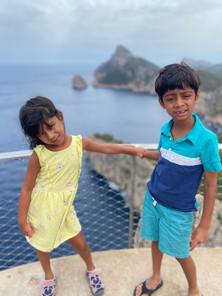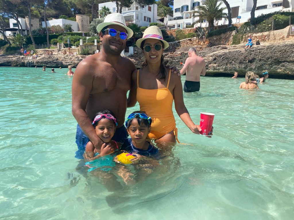After a wonderful week in Costa Brava, we drove back to Barcelona to take a seamless Vueling flight to Mallorca (all bags intact this time!). We were excited to visit our 2nd Balaeric island after Ibiza ten years ago. From the airport we drove to Valldemossa on the west of the island where we visited the monastery, palace and the gardens after a quick lunch. The kids were fascinated by the gigantic statues of the king and queen, similar to what they had seen in Barcelona. From there we drove to the little town of Cala pi where the kids found a playground and we ate some amazing Paella at Restaurant Sa Teressa. The highlight of the day was meeting Nani, Dhara masi, Kunal uncle and his family at a beautiful beachfront house in Colonia sant Jordi, on the south side of the island. The kids were delighted to meet family and to get to stay up way past their bed time!