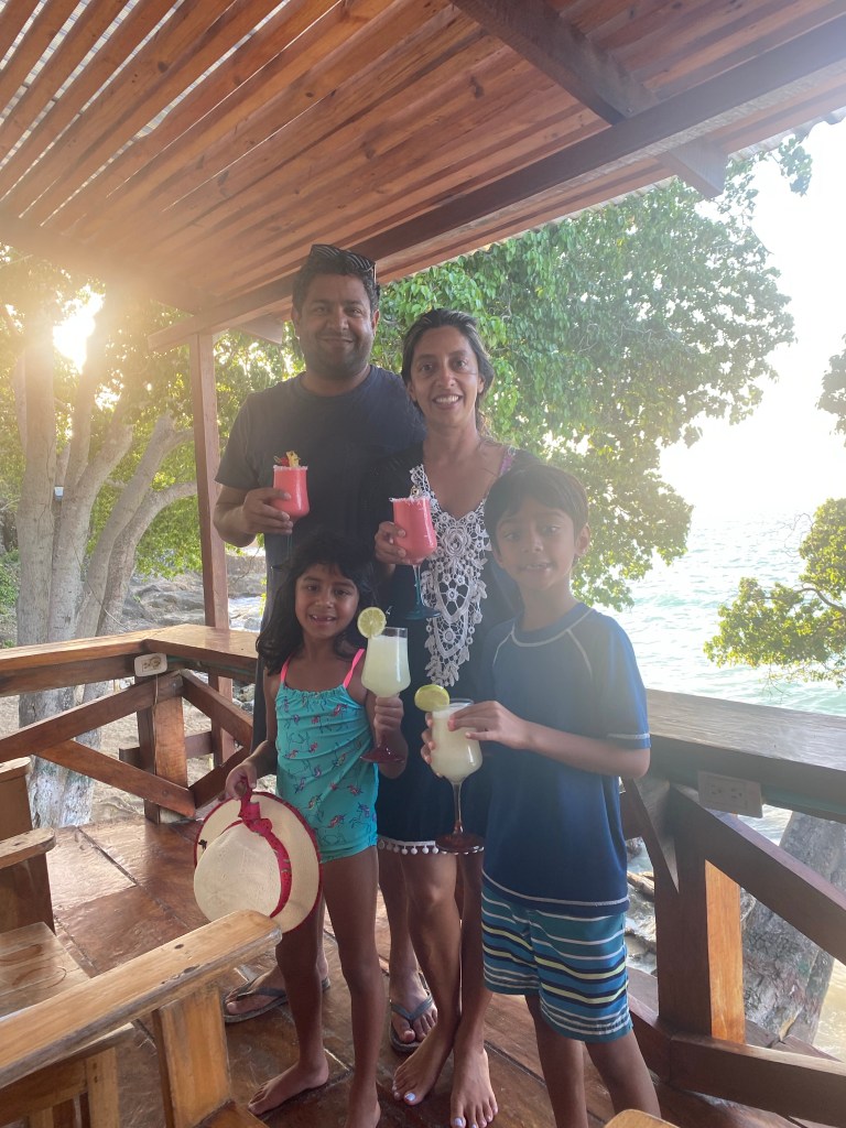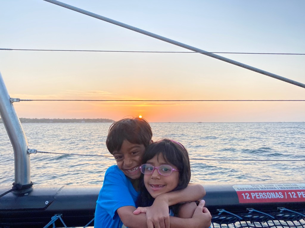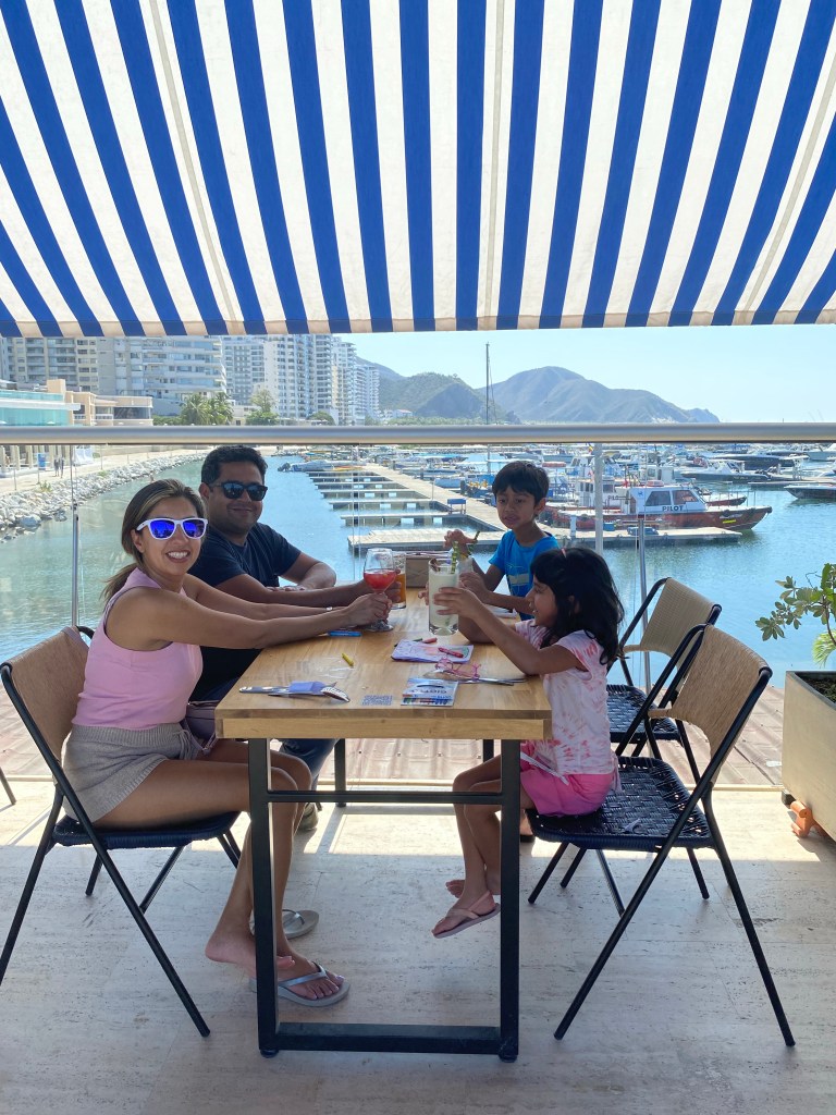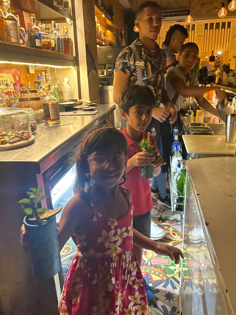 Our last stop for the last 4 nights was the international city of Cartegena. Founded in the early 1500s, Cartegena is a walled city with a ton of history, culture, live music, lights, nightlife, dining and stunning sunsets. We stayed at the Hilton located at the tip of Bocagrande with a beach and four pools. It was perfect with the kids as it had a kids club and served as a nice break from the afternoon heat. We started the first evening with a drink watching the sunset at Cafe Del Mar sitting atop the wall and ended it at The Arsenal: Rum Box, a wine and chocolate tasting restaurant where the kids got to make their own mocktail at the bar! The next morning we joined a free walking tour of the old town that walked us through the charming streets and squares over two hours. Ayaan and Ariana did really well even in the heat and we were all rewarded with a delicious local lunch at San Valentin along with live music. After some pool time, we went on a sunset catamaran cruise overlooking Cartegena that ended with Ariana and Anjali dancing to Colombian music with the locals.