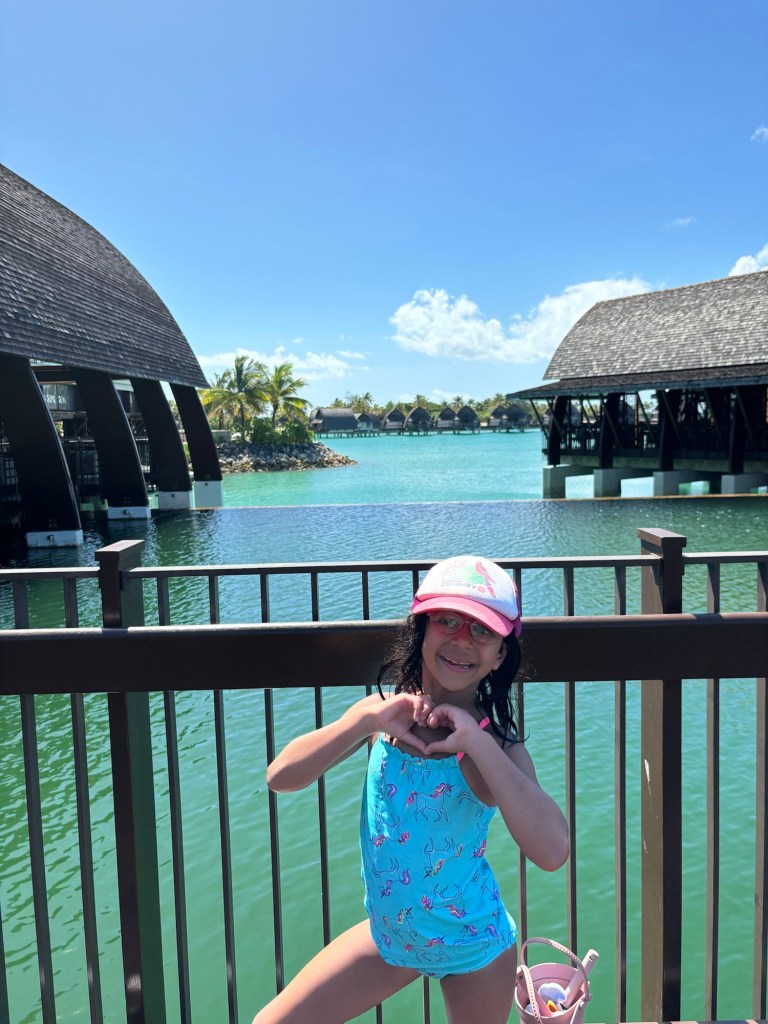 Our next three days were perhaps the biggest splurge of our summer adventure (Seychelles isn’t cheap, especially after a month in Asia), as we took a 45 minute boat ride to the Hilton Labriz resort, located on the private Silhouette Island. Like a scene out of White Lotus, the staff at the jetty waved at us and gave us a tour of the property in a buggy. Our stay was exactly what we needed – relaxing in a beachfront villa spending most of our days moving between the white sandy beaches, warm pool, and the various activities and restaurants. Ariana was occupied by the kids club braiding her hair, painting her face, baking cookies and making friends. Ayaan enjoyed biking around the island, playing ping pong and mini golf, and pushing around the pool bean bags. The island had tortoises once again, as well as large hermit crabs, and baby sharks. The dinners were memorable and included grilled seafood on the beach, Asian fusion overlooking the ocean, a local dinner, and an incredible breakfast each morning.