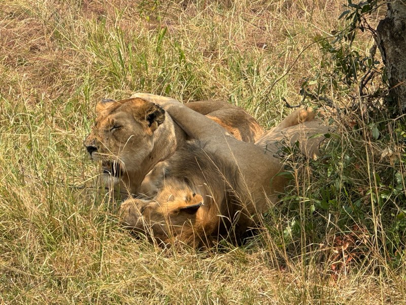 We made an early start with a sunrise game drive this morning as we made our way to the Mara river crossing. On the way, we were greeted with Cape buffalos, hyenas, a jackal around a herd of impalas, stalks and a large herd of hundreds of wildebeest running across our path as they migrated north. This sight is awe inspiring and we wished we could have stayed longer (but our guide was eager to make it to the river close to the Tanzania border). We were lucky to witness 9 lions today including a ‘honeymoon couple’ as our guide called it, as well as a leopard hiding in a ditch. Once we arrived at the river, we saw a crocodile tearing up a wildebeest as well as tens of hippos. Overall though, we found the Mara river experience somewhat underwhelming given the hype. We made it back to our camp a few hours later in time for a shower and dinner followed by a nightcap at the campfire.