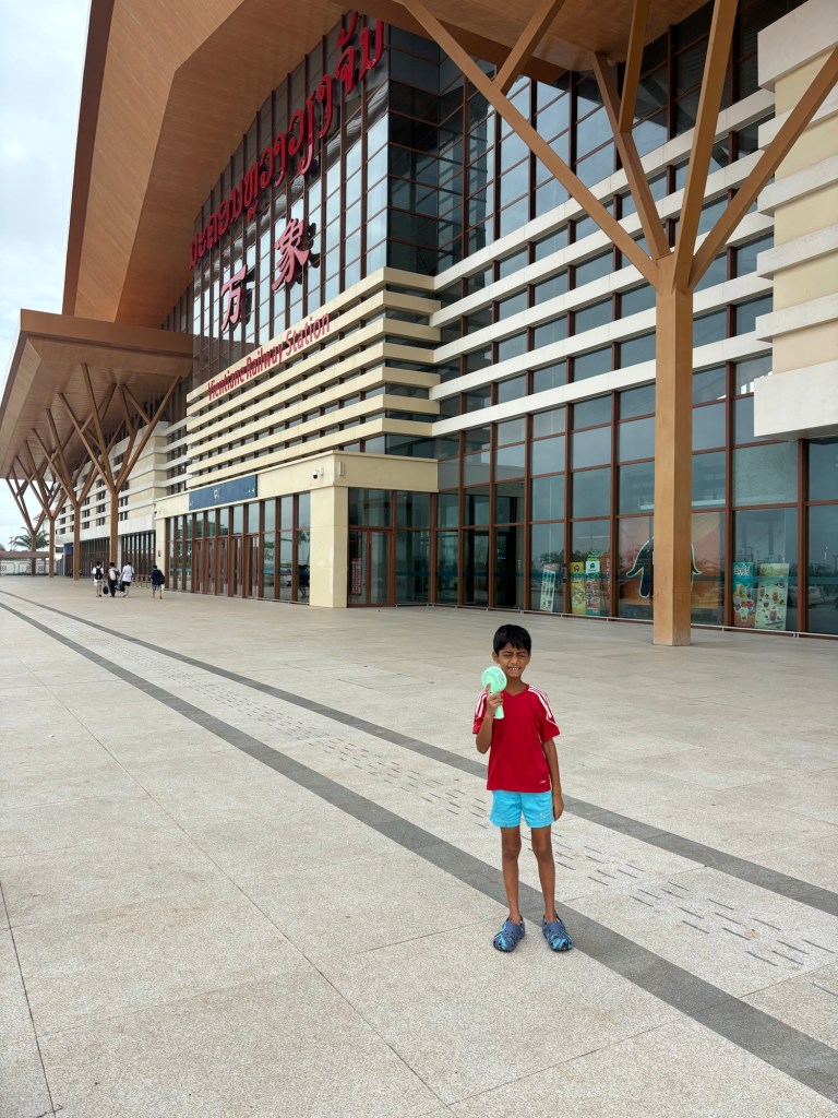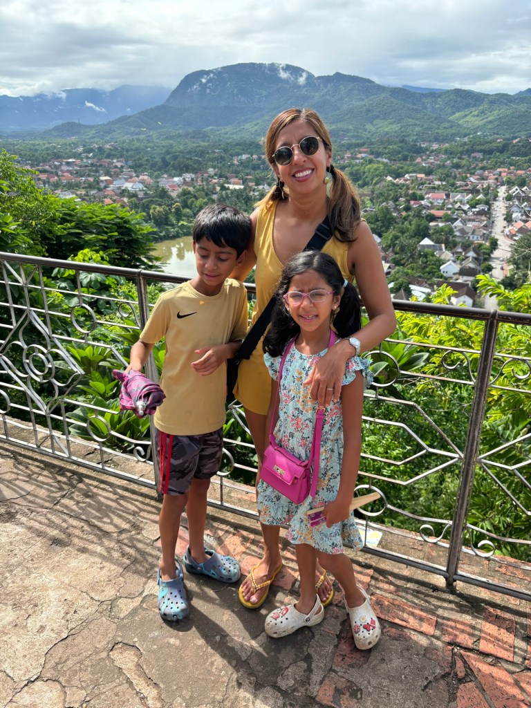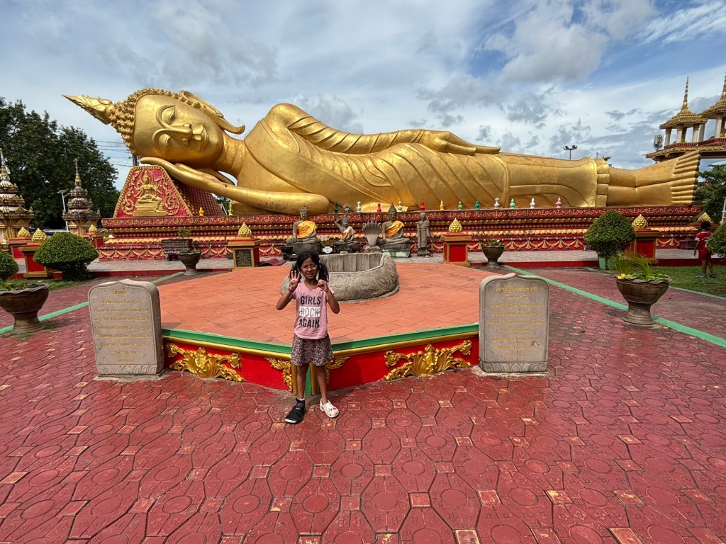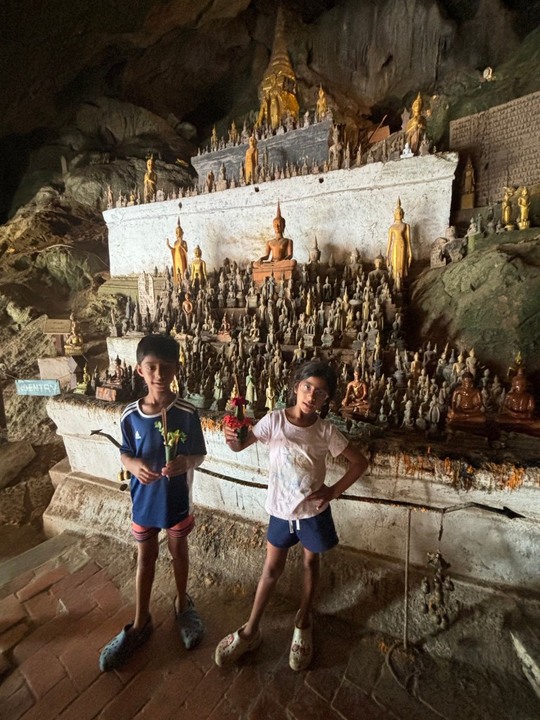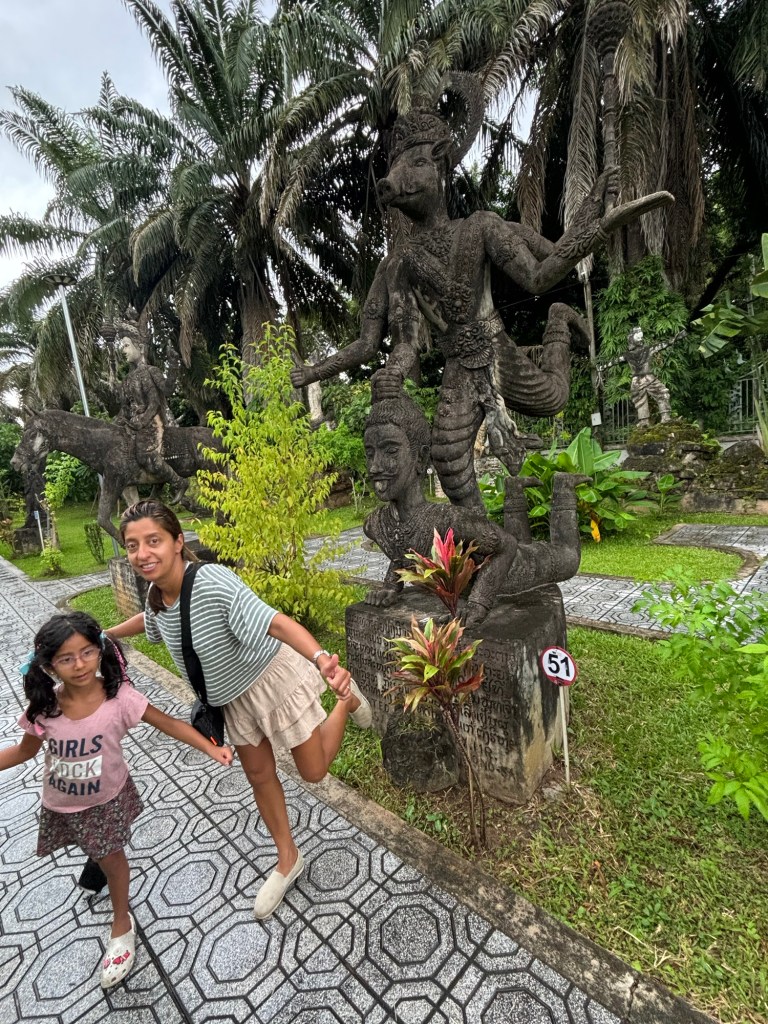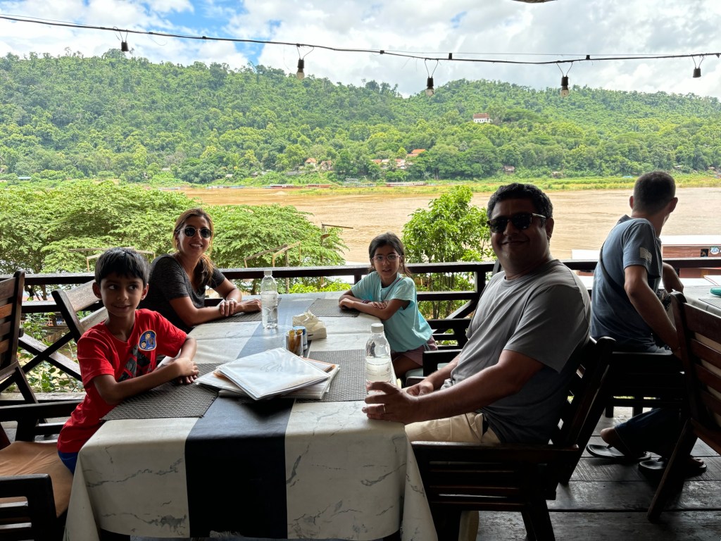 We arrived in Vientiane, the capital of Laos, and checked into the Lao Poet hotel with its rooftop pool. Laos doesn’t have Uber or Grab, so we used the local equivalent called Loca or just grabbed a tuk-tuk that we all enjoyed. With just half a day in Vientiane, we ventured out driving by Patuxay, an India gate or Arc de Triomphe like structure (Laos was ruled by the French). Our first stop was the national monument of Pha That Luang, a massive Stupa with a large reclining Buddha next door. We loved that there was absolutely no one here since we were visiting during the off season. Ayaan was very excited when we were picked up in a BYD, Teslas biggest competitor, to take us 30 mins away to the Buddha Park. We were welcomed here with a downpour and bug bites, but still really enjoyed walking through the park with over 60 statues. The most memorable was a stupa that we could climb on top of and get a stunning view of the entire park. After a dip in the rooftop pool, we visited the night market where Anjali and Ariana bought a purse, and Ayaan bought a USB mobile fan! We ended the night with dinner at a local Laotian restaurant playing local live rock music. Laotian food is a mix of Thai and Cambodian food with shrimp paste in everything – good, but definitely not as good as Thai food.