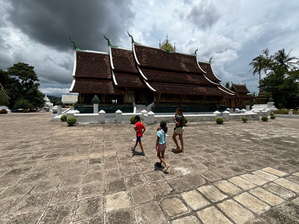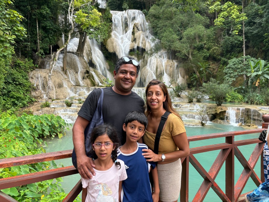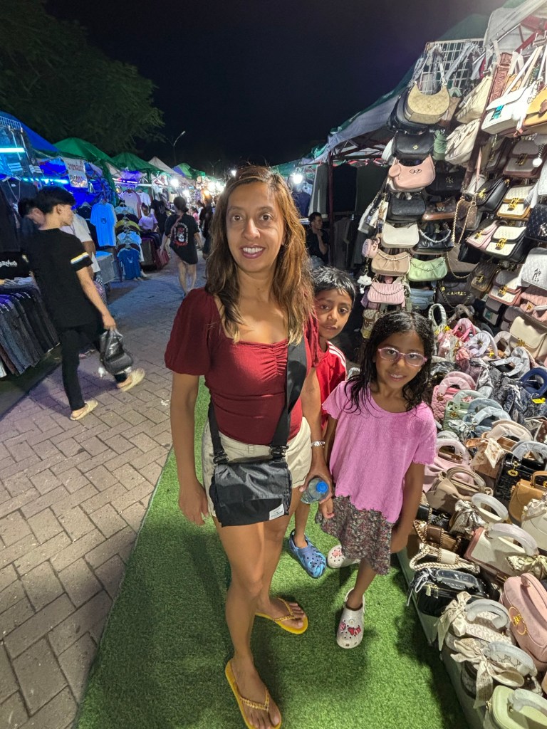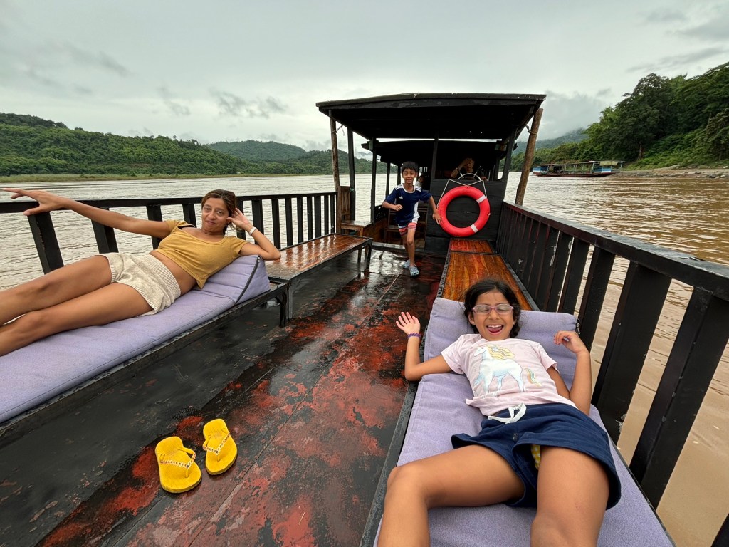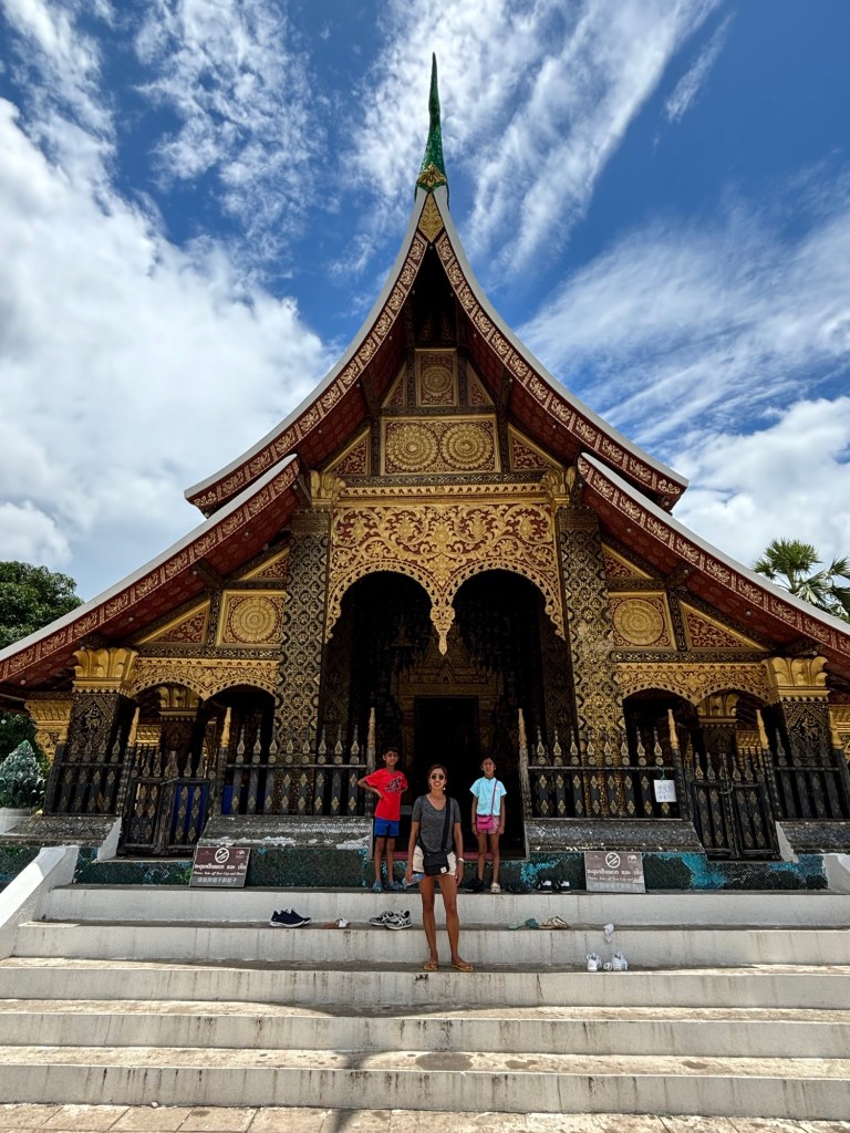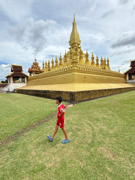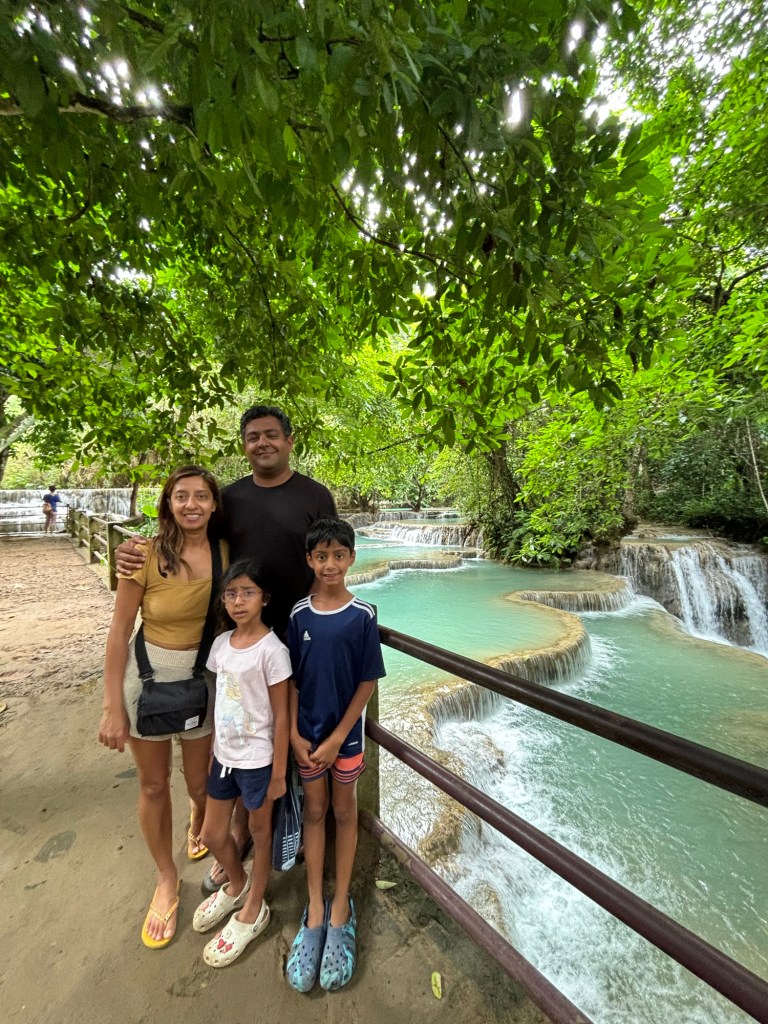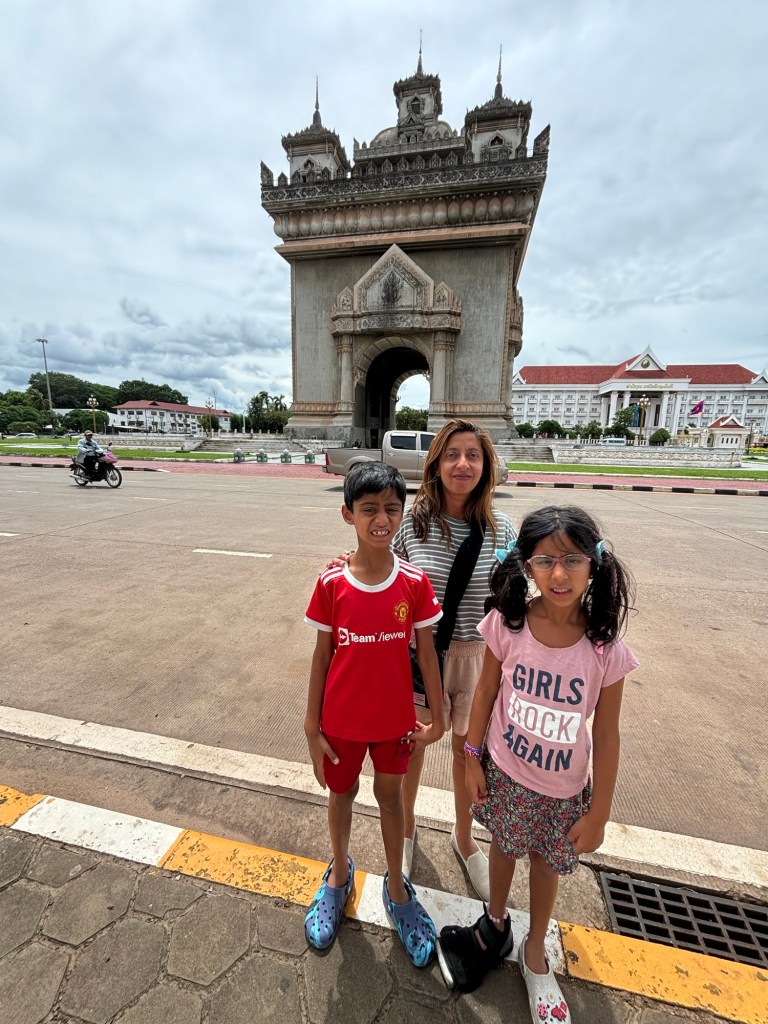 We arrived in Vientiane, the capital of Laos, and checked into the Lao Poet hotel with its rooftop pool. Laos doesn’t have Uber or Grab, so we used the local equivalent called Loca or just grabbed a tuk-tuk that we all enjoyed. With just half a day in Vientiane, we ventured out driving by Patuxay, an India gate or Arc de Triomphe like structure (Laos was ruled by the French). Our first stop was the national monument of Pha That Luang, a massive Stupa with a large reclining Buddha next door. We loved that there was absolutely no one here since we were visiting during the off season. Ayaan was very excited when we were picked up in a BYD, Teslas biggest competitor, to take us 30 mins away to the Buddha Park. We were welcomed here with a downpour and bug bites, but still really enjoyed walking through the park with over 60 statues. The most memorable was a stupa that we could climb on top of and get a stunning view of the entire park. After a dip in the rooftop pool, we visited the night market where Anjali and Ariana bought a purse, and Ayaan bought a USB mobile fan! We ended the night with dinner at a local Laotian restaurant playing local live rock music. Laotian food is a mix of Thai and Cambodian food with shrimp paste in everything – good, but definitely not as good as Thai food.
