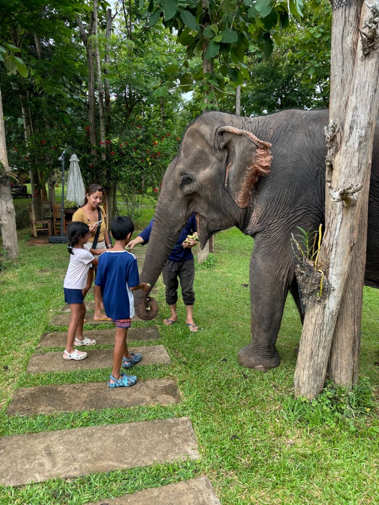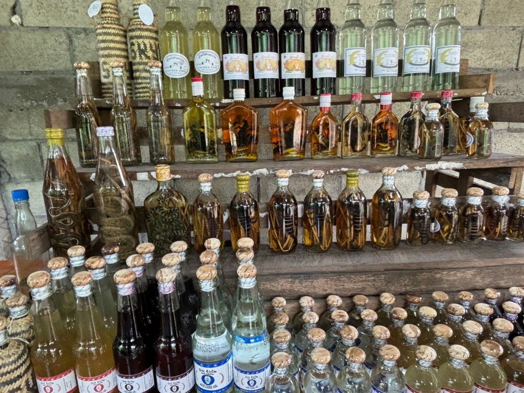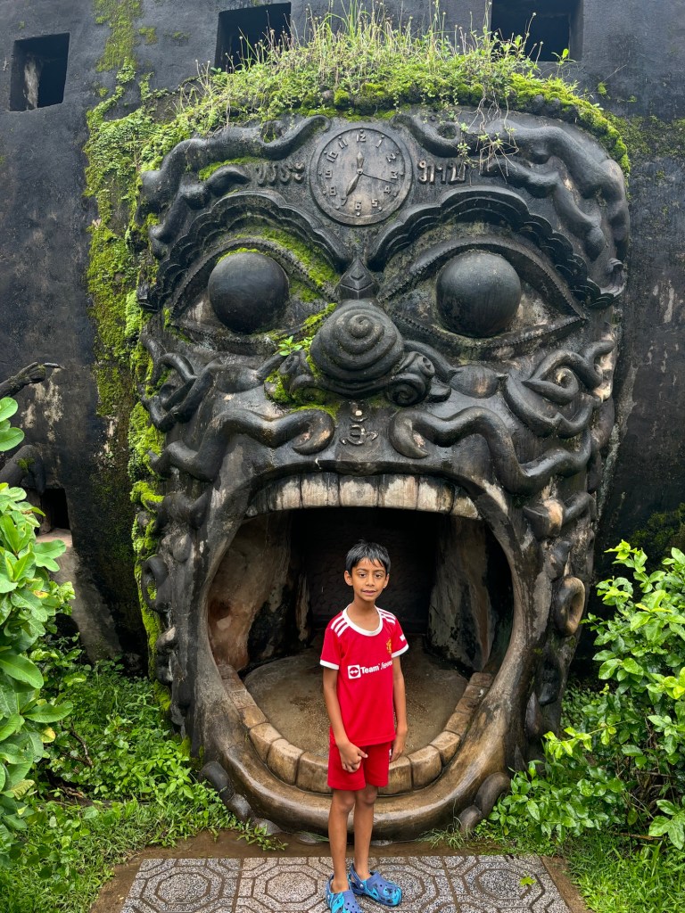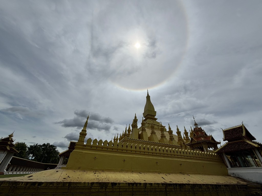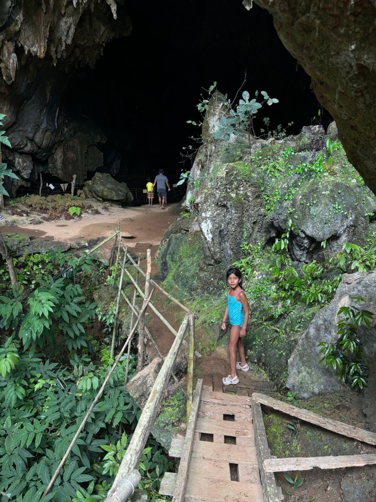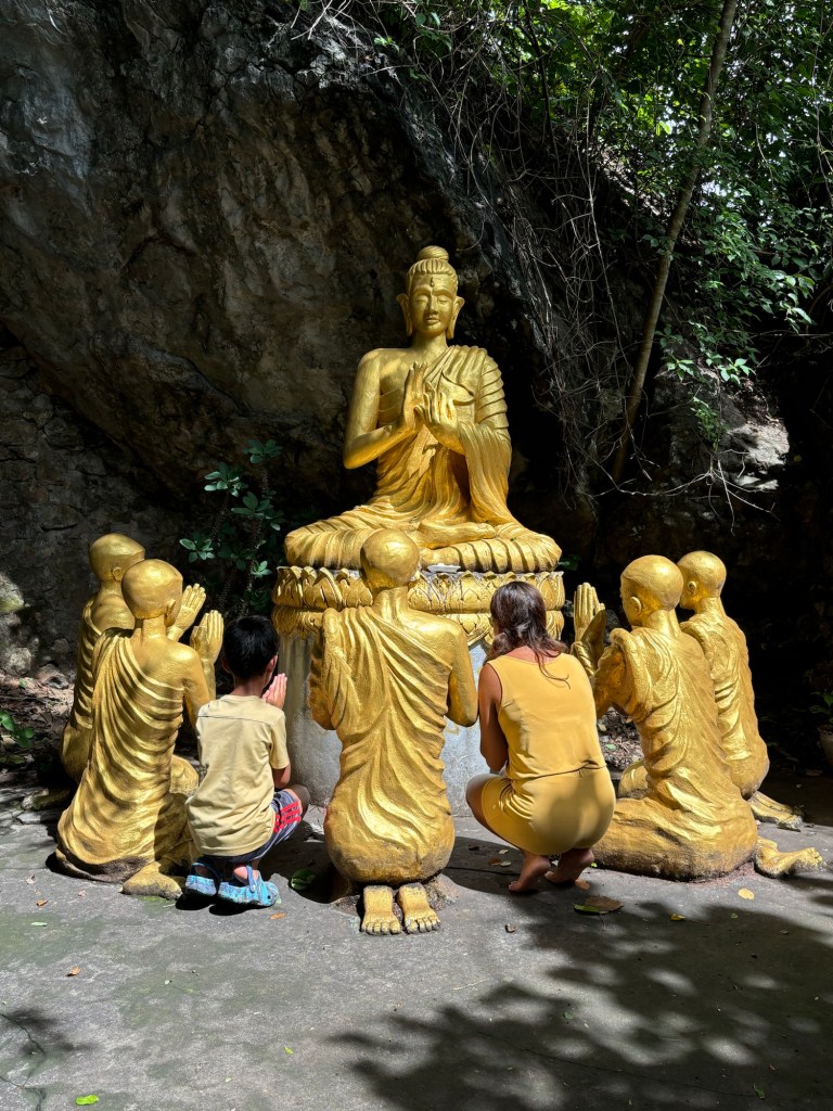 We arrived in Vientiane, the capital of Laos, and checked into the Lao Poet hotel with its rooftop pool. Laos doesn’t have Uber or Grab, so we used the local equivalent called Loca or just grabbed a tuk-tuk that we all enjoyed. With just half a day in Vientiane, we ventured out driving by Patuxay, an India gate or Arc de Triomphe like structure (Laos was ruled by the French). Our first stop was the national monument of Pha That Luang, a massive Stupa with a large reclining Buddha next door. We loved that there was absolutely no one here since we were visiting during the off season. Ayaan was very excited when we were picked up in a BYD, Teslas biggest competitor, to take us 30 mins away to the Buddha Park. We were welcomed here with a downpour and bug bites, but still really enjoyed walking through the park with over 60 statues. The most memorable was a stupa that we could climb on top of and get a stunning view of the entire park. After a dip in the rooftop pool, we visited the night market where Anjali and Ariana bought a purse, and Ayaan bought a USB mobile fan! We ended the night with dinner at a local Laotian restaurant playing local live rock music. Laotian food is a mix of Thai and Cambodian food with shrimp paste in everything – good, but definitely not as good as Thai food.