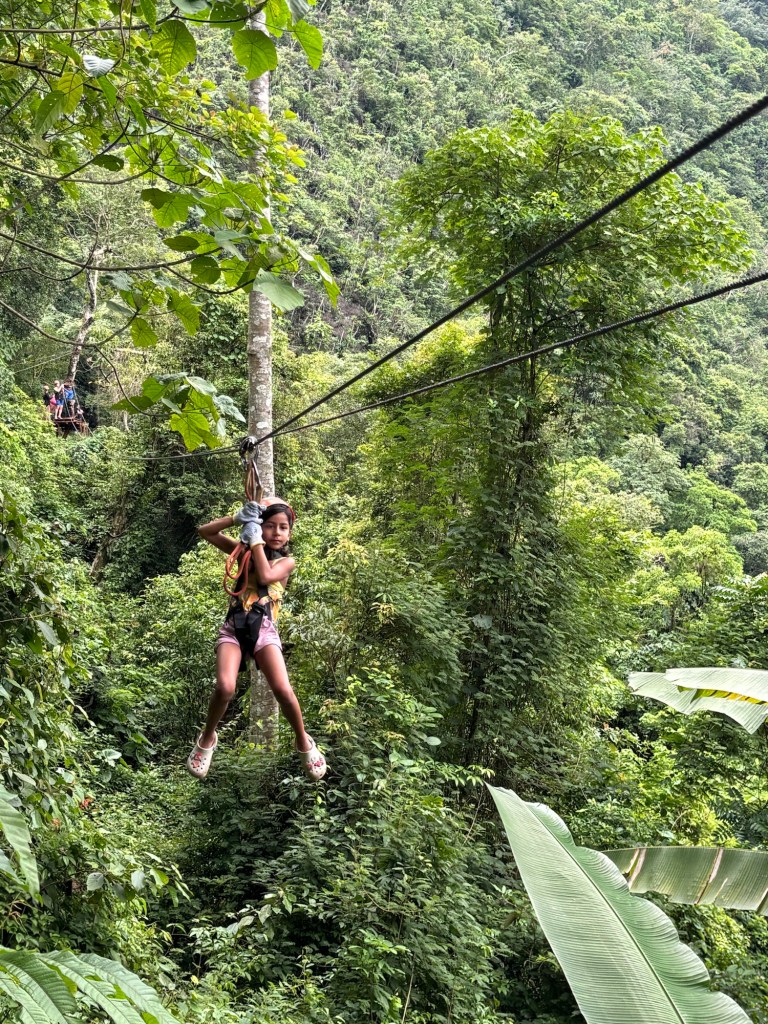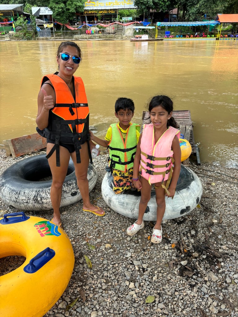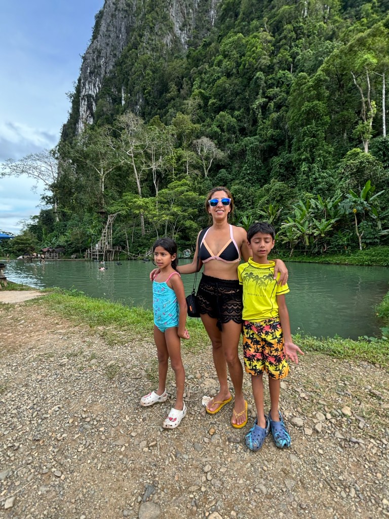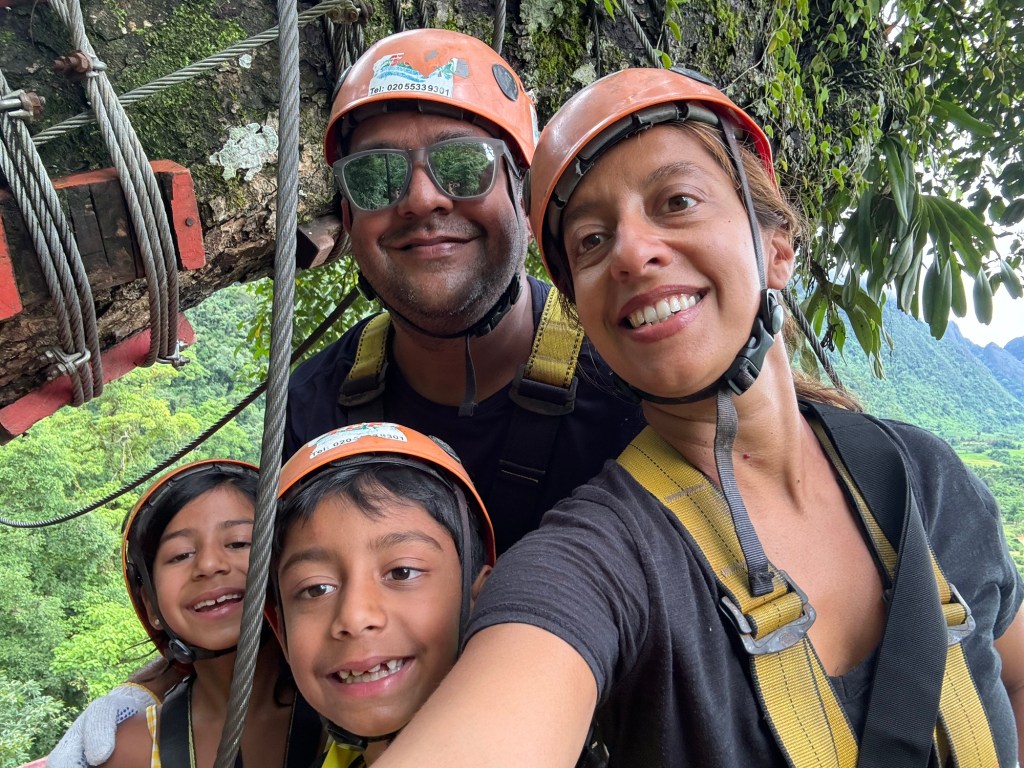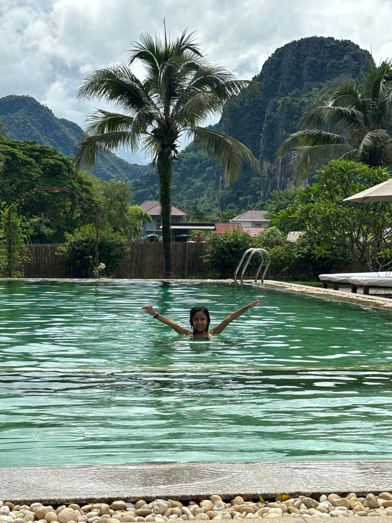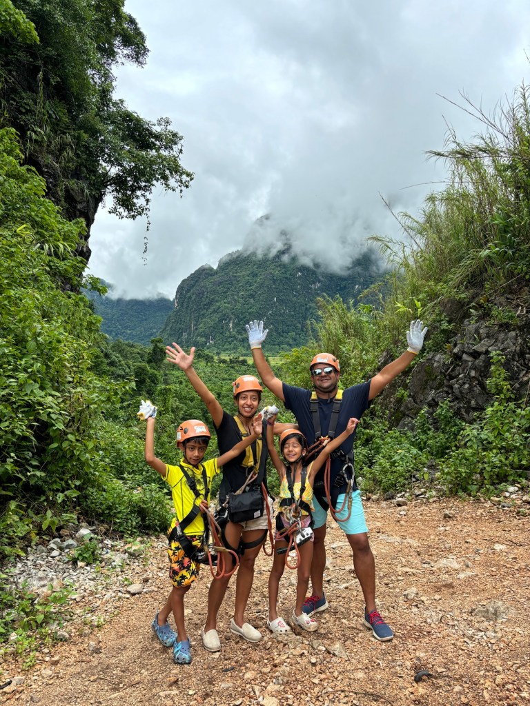 Our 2nd destination in Laos was the nature town of Vang Vieng, surrounded by breathtaking scenery. We took the modern Lao-China train, a short 50 min ride, to this small town that reminded us of the Cat Ba island on Ha Long Bay. We absolutely loved our time at Vang Vieng and the Riverside Boutique hotel. We spent our couple of days here relaxing by the pool overlooking the towering mountains, getting a Laotian massage or going on a few adventures. We rented a 4WD run down buggy to drive around west Vang Vieng through rice fields, bridges across the Nam Song river, green mountains and very bumpy roads. We stopped to walk into a cave with stalactites and stalagmites, and to dip in the cool Blue Lagoon 3 on another hot day. We also took a tour in Vang Vieng through 10 zip lines, tubing the now brown Nam Song river, and jumping off a 5m board into Blue Lagoon 1. Ayaan and Ariana thoroughly enjoyed the adrenaline rush during these activities. We highly recommend Vang Vieng for everyone, including families.