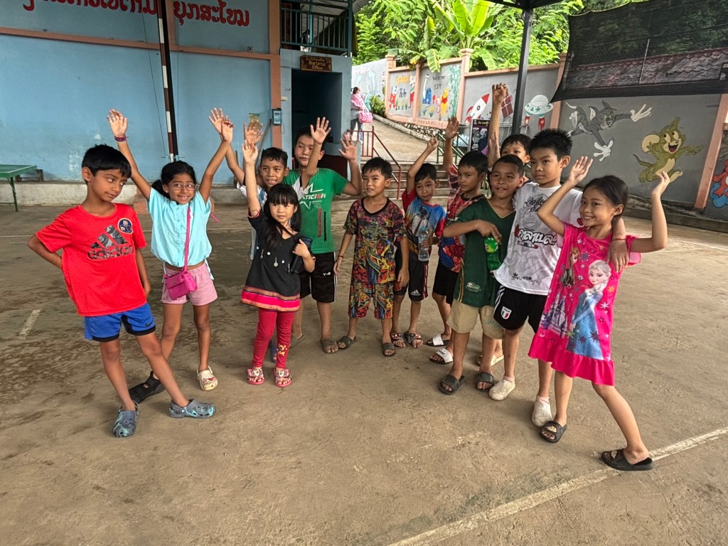 Our final destination in Laos was the word famous UNESCO heritage city of Luang Prabang. After another 50 min Lao-China train ride, we checked into the On the Mekong resort that was, you guessed it, right on the Mekong river with the best sunset views in Luang Prabang. We had a Laotian lunch on the river in town where a Canadian expat, who started the first private fire company in this communist country, shared his tips and tricks about Luang Prabang and Laos. Next door, we visited the famous Buddhist temple Wat Xieng Thong and set out on the highlight of the day – spending a couple of hours playing with kids 6-10 years old at a local school Big Brother Mouse 2. The goal was to interact with them in English so they could improve their skills. Ayaan played soccer with the boys, while Ariana played some board games with the other children. The school children were very curious and asked us a lot of questions! That night we ate at the many stalls of the night market (Ayaan enjoyed the chicken skewer and Ariana at a Vietnamese spring roll) and had a night cap nearby at the Avani hotel (I enjoyed my peppercorn flavored old fashioned).